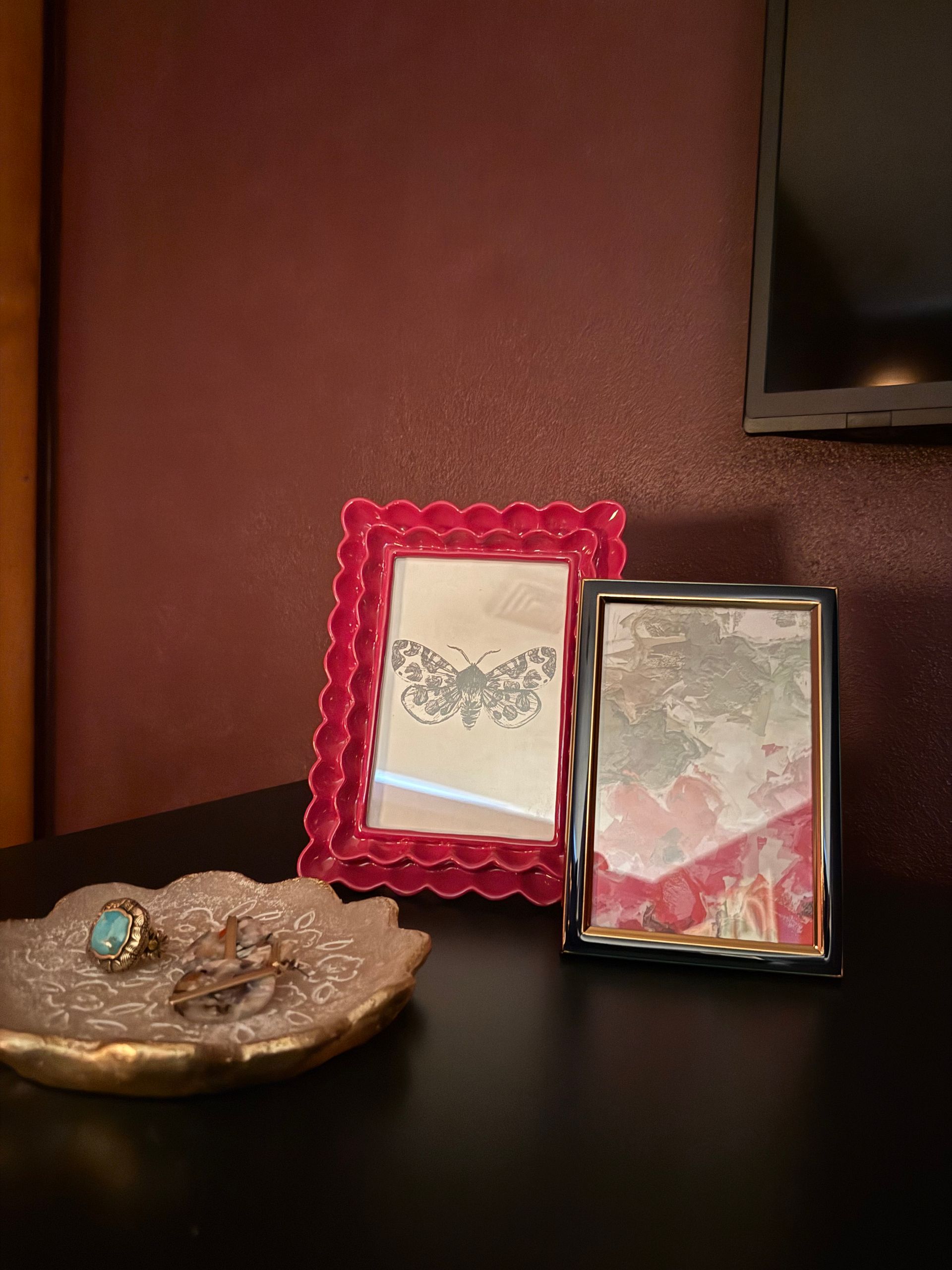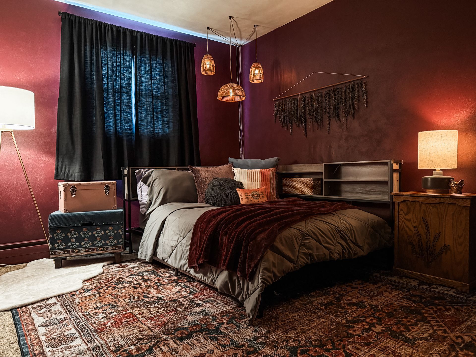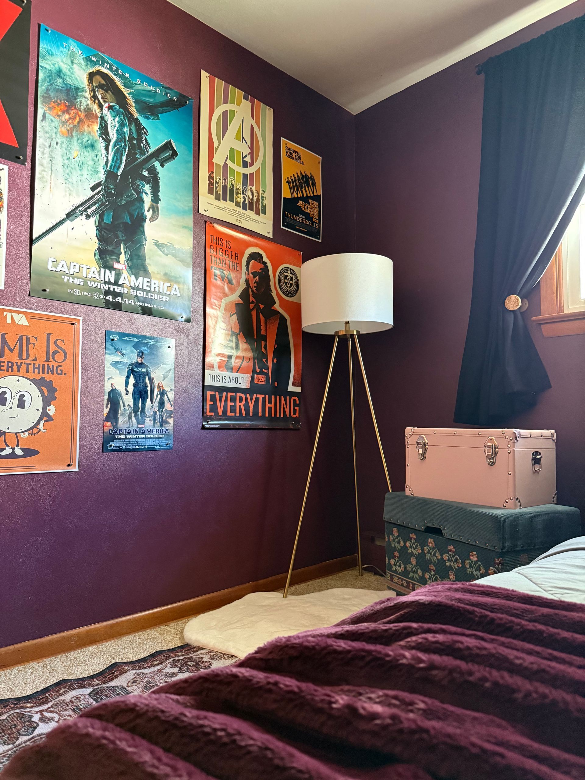 Her sister, a high school junior, wanted something a bit moodier that captured her unique interests and really reflected her personal style. While we kept her bed, curtains, and nightstand that she loved, we reworked her layout so that her bed became the focal point of the room when you walked in. Deep merlot walls, layered lighting, and jewel tones all amp up the drama and the cozy factor. A new Navy dresser gives plenty of room for clothes. A stacked ottoman and trunk serve as additional storage for books. Her favorite part? The custom gallery wall of Marvel Posters-- a teen's dream!