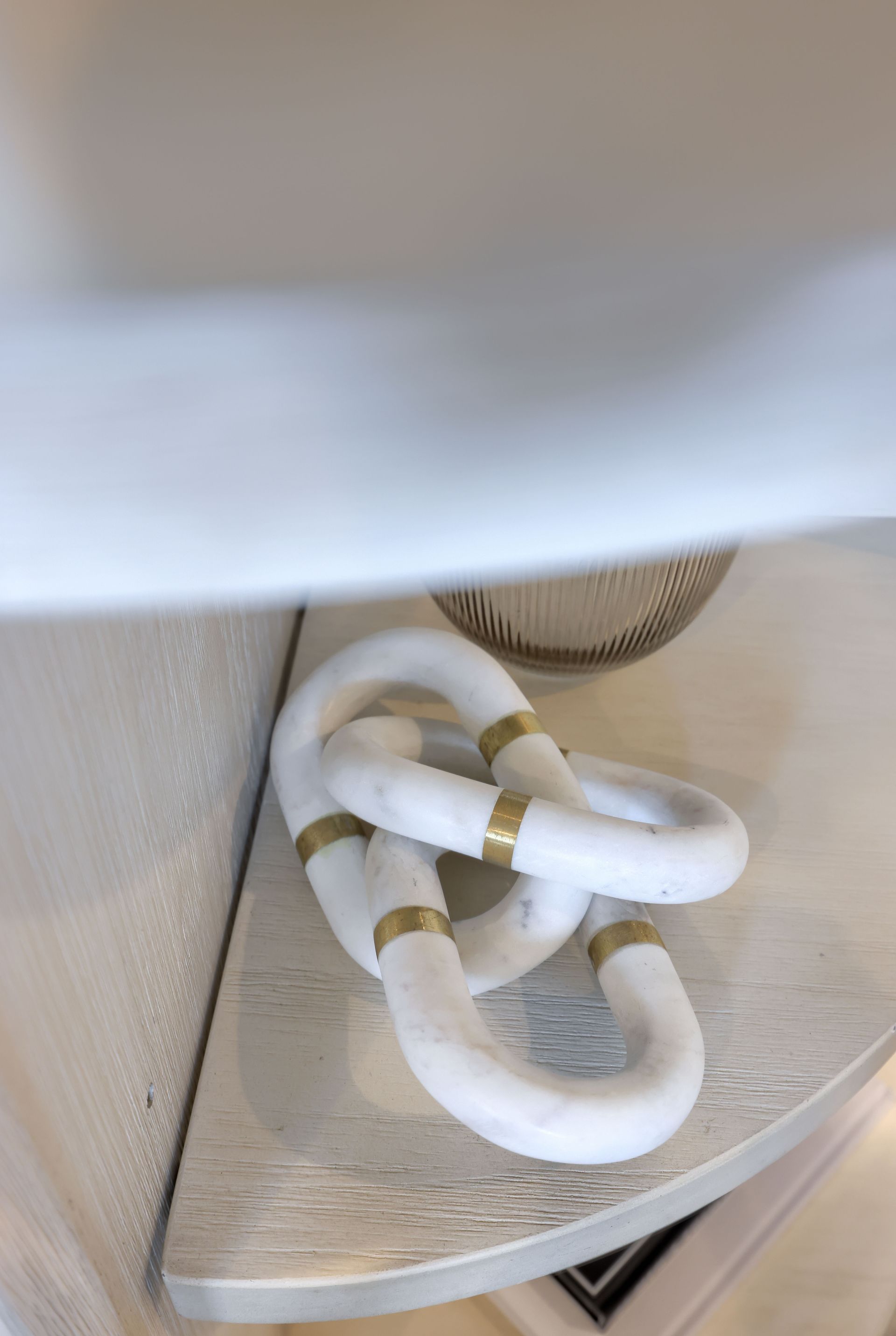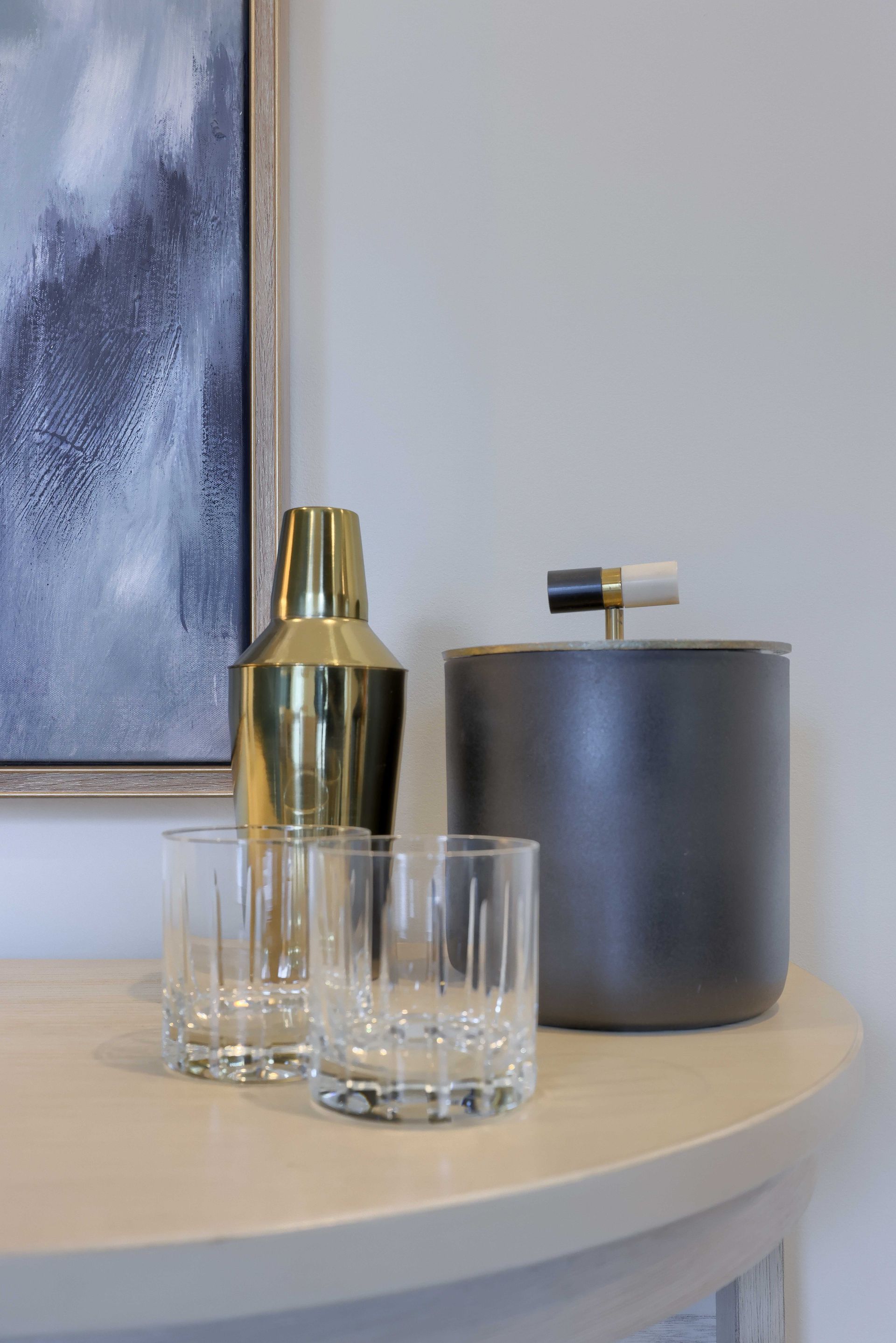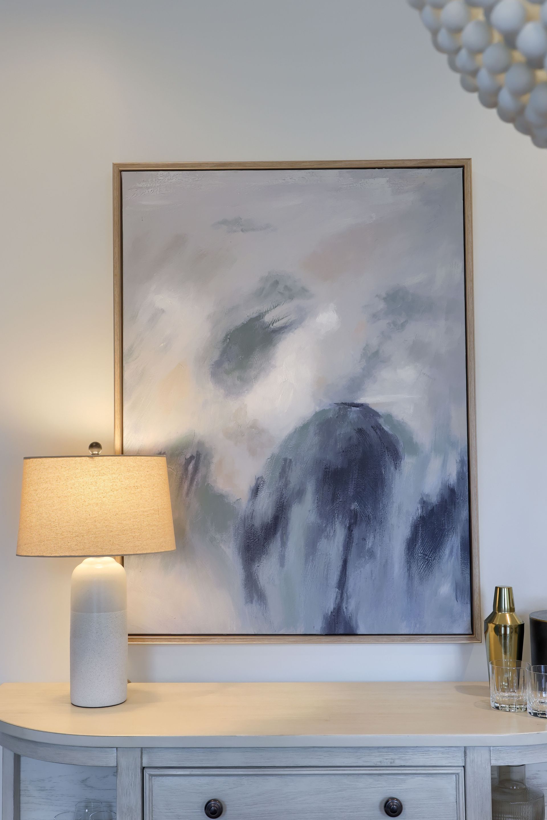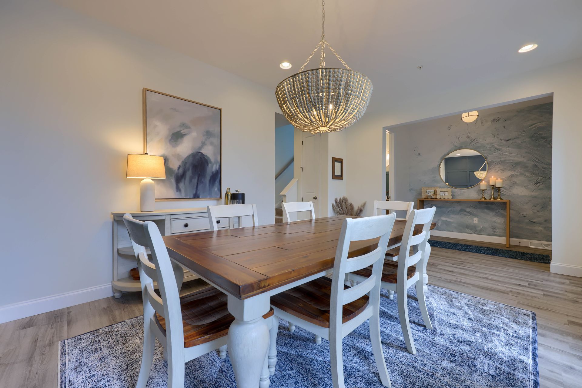 Major interest was added in the entry with this wall mural that gives the appearance of a textured, ombre painted wall. It's the perfect backdrop for this gorgeous custom white oak waterfall table! New lighting, statement mirror, runner and decor complete the space. All in all, it definitely creates a moment the second you step in the door!