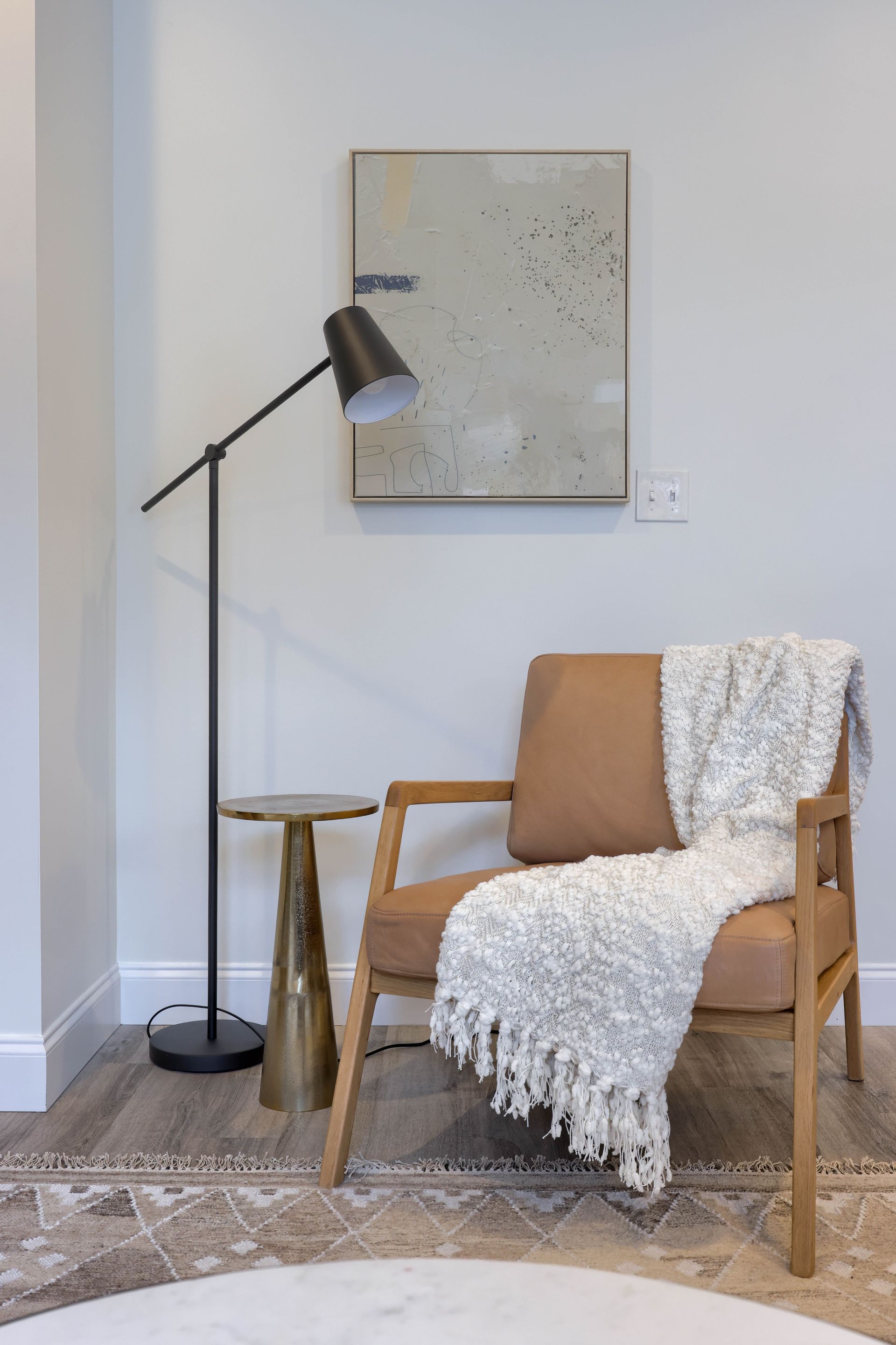 The dining room is a big testament to the power of rugs, lighting, and window treatments! In this space, the homeowners did not have much in the room other than the core furniture and were looking to make the space feel finished and inviting. To do so, we went for high impact with the wall treatment, chandelier, and large art piece and kept the rest of the styling simple. The rug and airy curtains add so much warmth to the room.