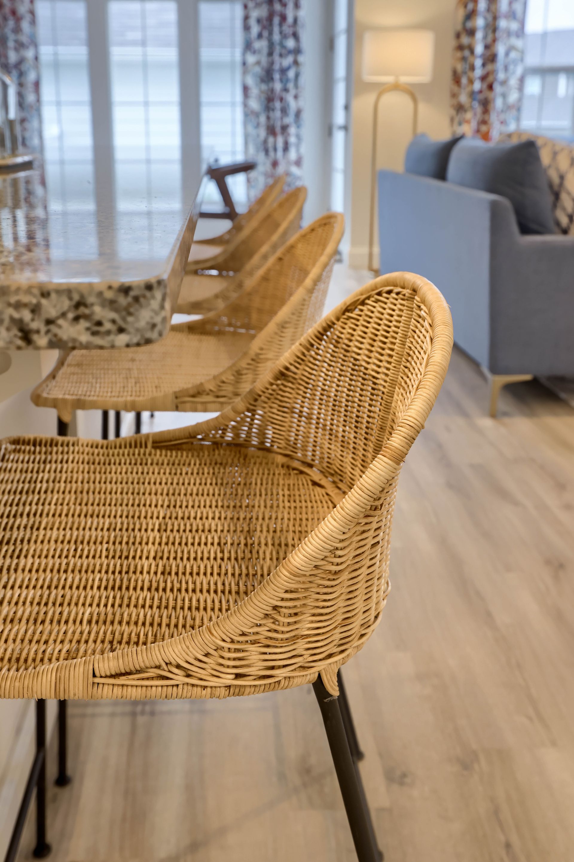 Essentially everything in the living room changed, but the biggest player in this transformation is the new fireplace wall with shelves. This impactful focal point completely changed the room, amped up the coziness, and provided so much opportunity for styling. Layer in the new sofas with brass legs, marble coffee table, and statement curtains, and our clients had the earthy coastal space they always dreamed of but didn't know how to implement in their home. The look extended to the connected kitchen with textured table, arch cabinet, and rattan lighting and stools.
