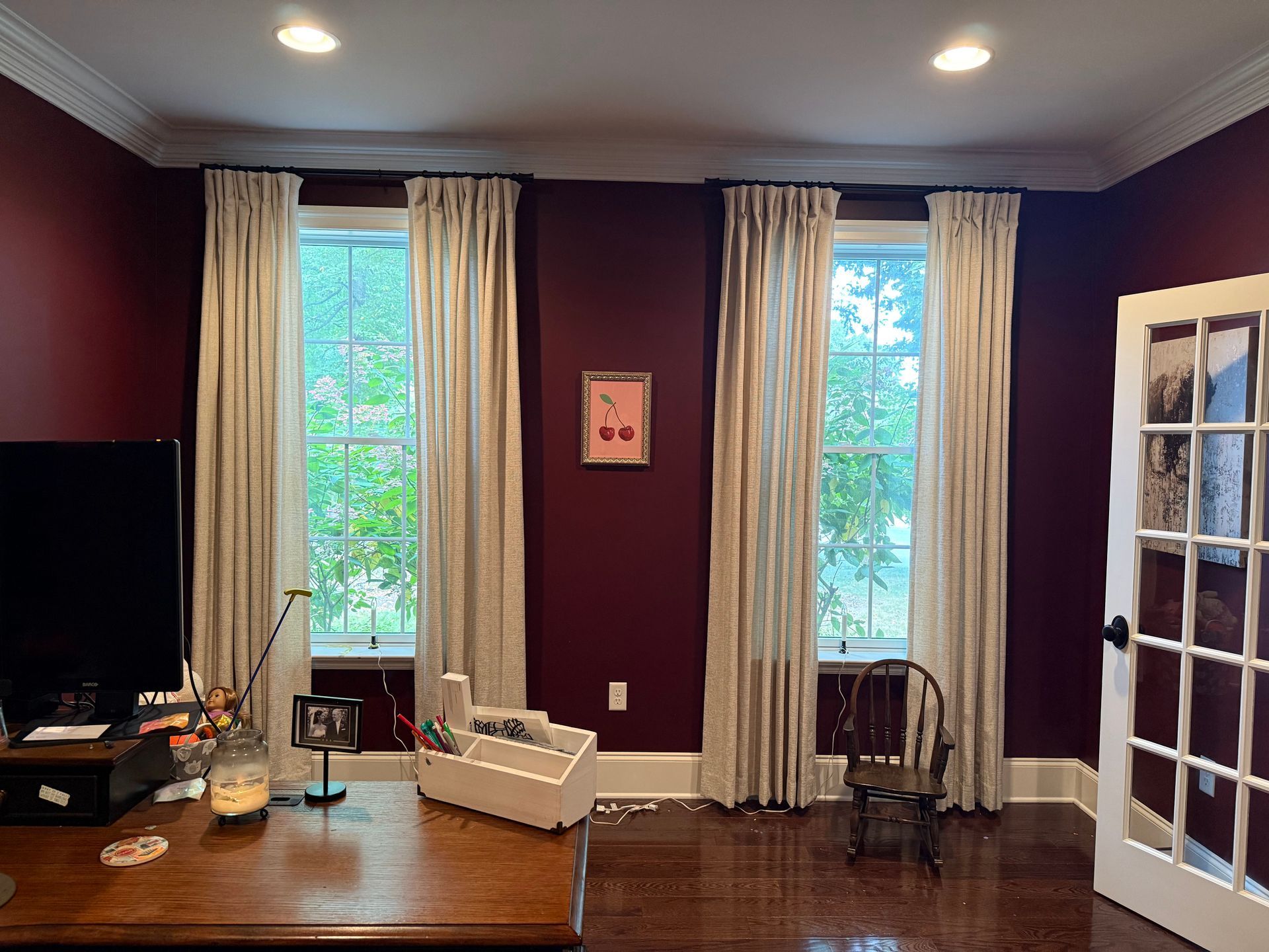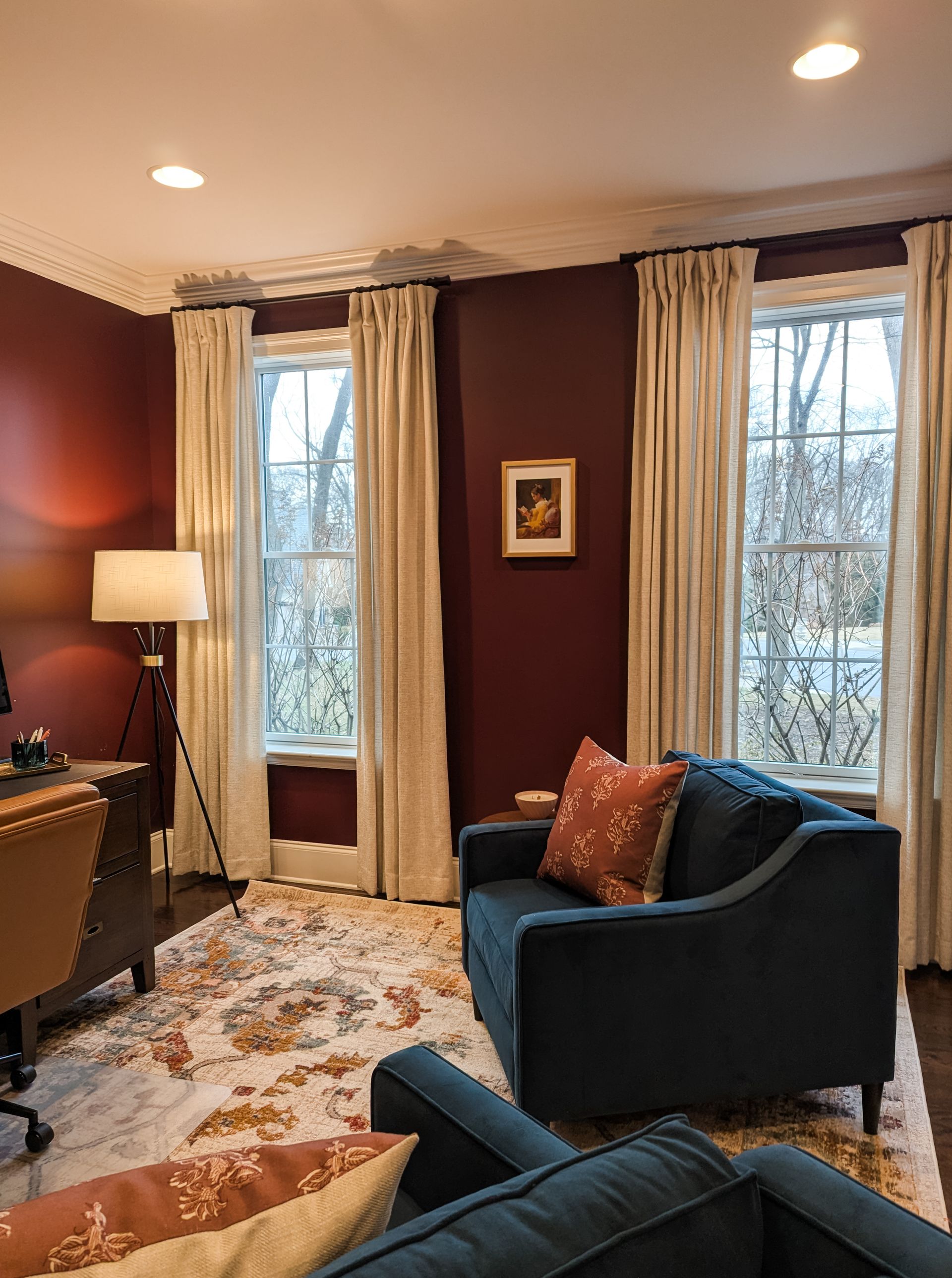 The goal in the office was a comfortable space that could function well for work but also provide a quiet, cozy space for crocheting and reading. A rework of the layout allowed space for two comfy armchairs to add seating to the room, as well as minimized the visual emphasis of the multiple monitors and accompanying cords. A large area rug played off of the beautiful paint color to add warmth. The desk chair, the workhorse of any office, is cushy enough for long periods of sitting but still stylish.