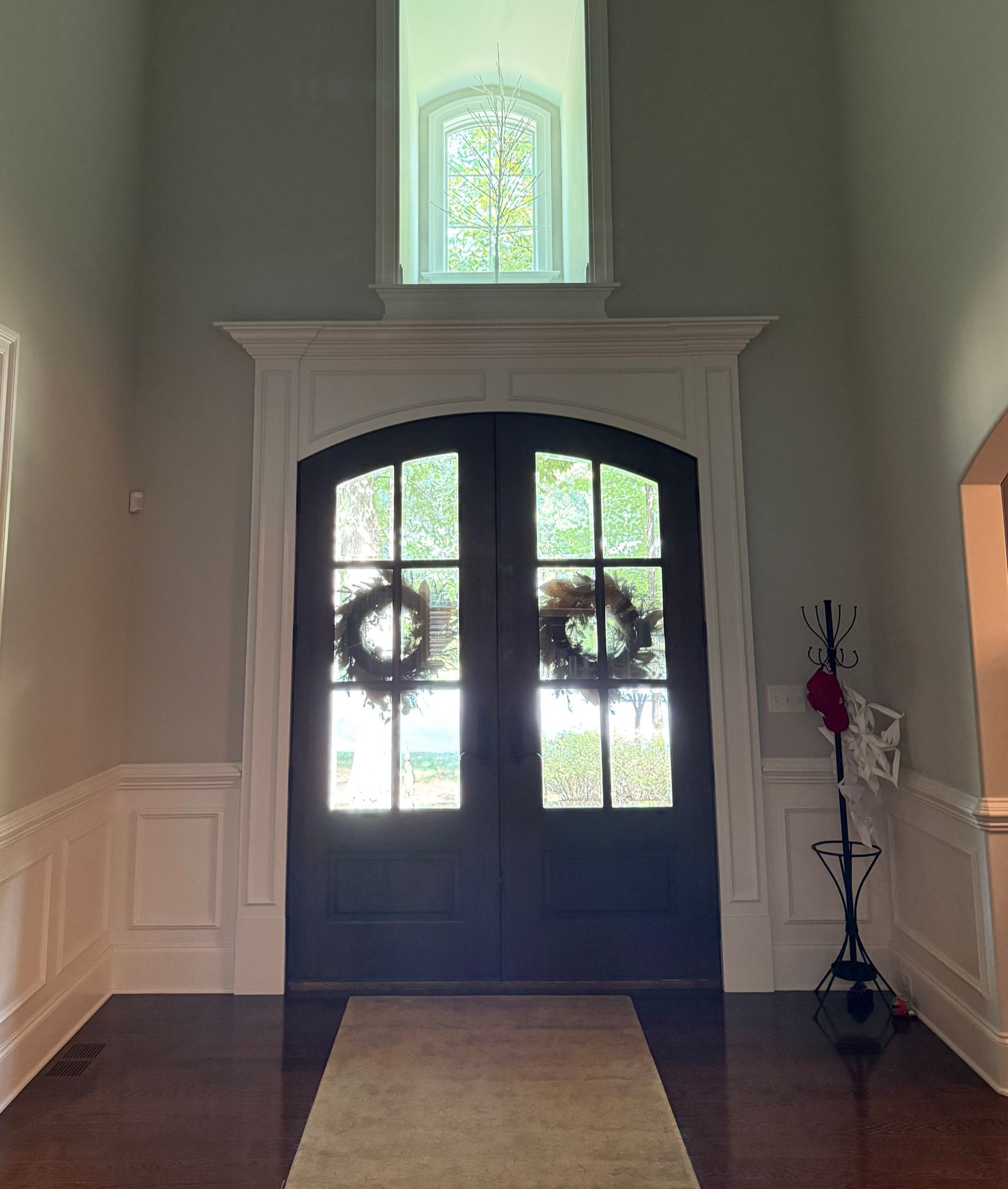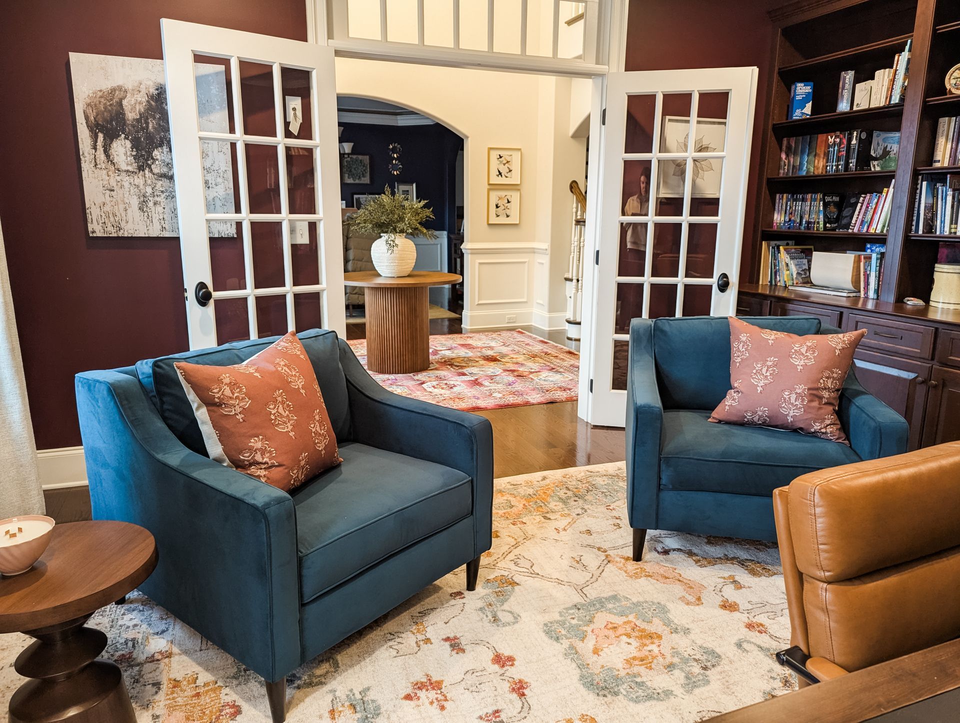 The office and foyer of this gorgeous Hershey area home were already chock full of beautiful features like soaring ceilings, French doors, built-in bookcases, and rich paint. But our clients wanted the office to have more function and warmth, and the large foyer to feel less empty and cavernous.