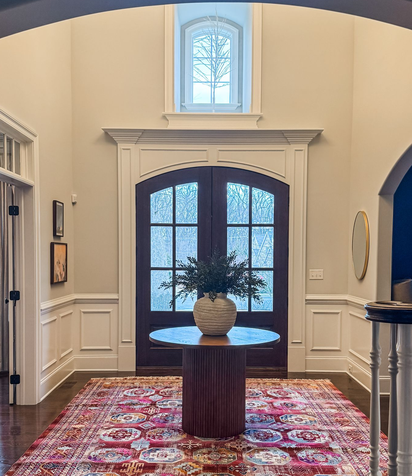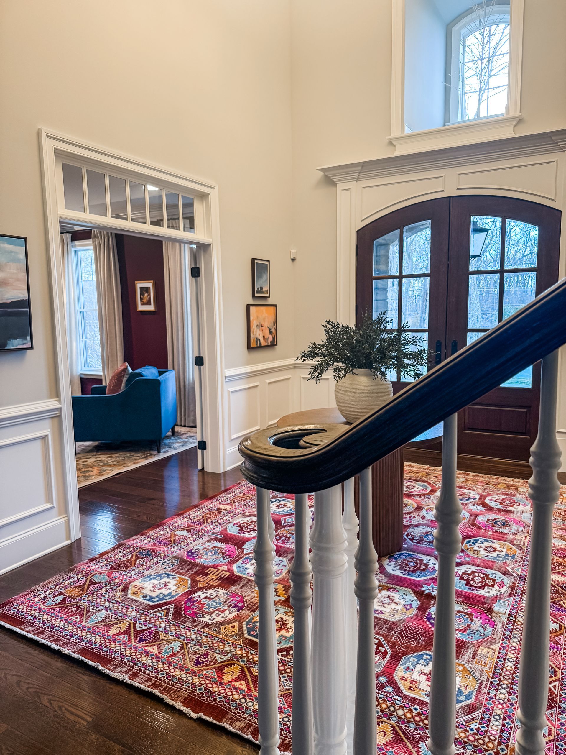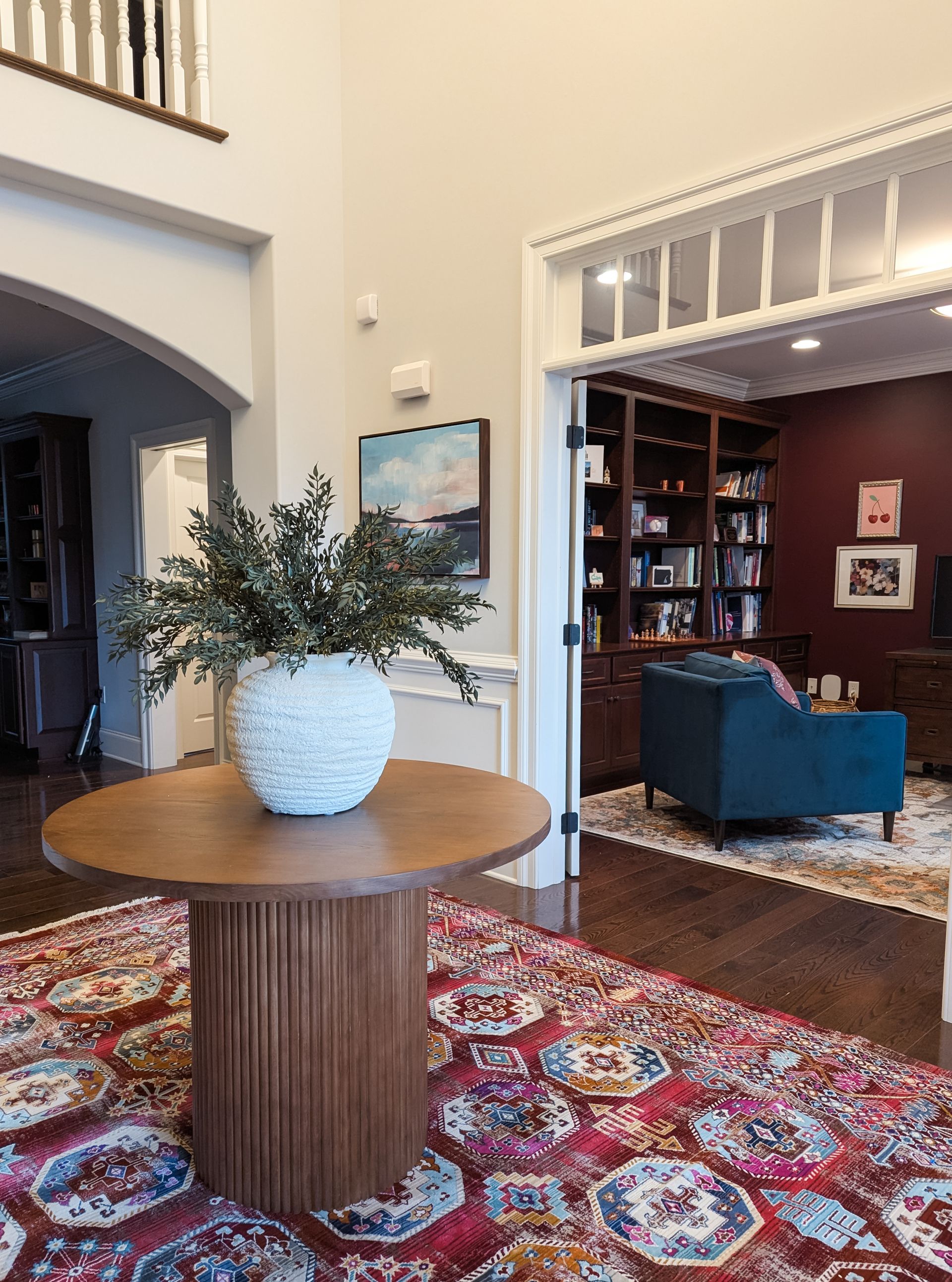 The foyer, which is the size of a small bedroom, was fairly empty and any art or furniture that was present was so small in scale in comparison to the size of the space. First and foremost, we knew a large, impactful area rug would immediately help fill the space. We also amped up the art, especially in color, to visually fill the space. Lastly, a round textured entry table with a large vase of stems capped off the design.