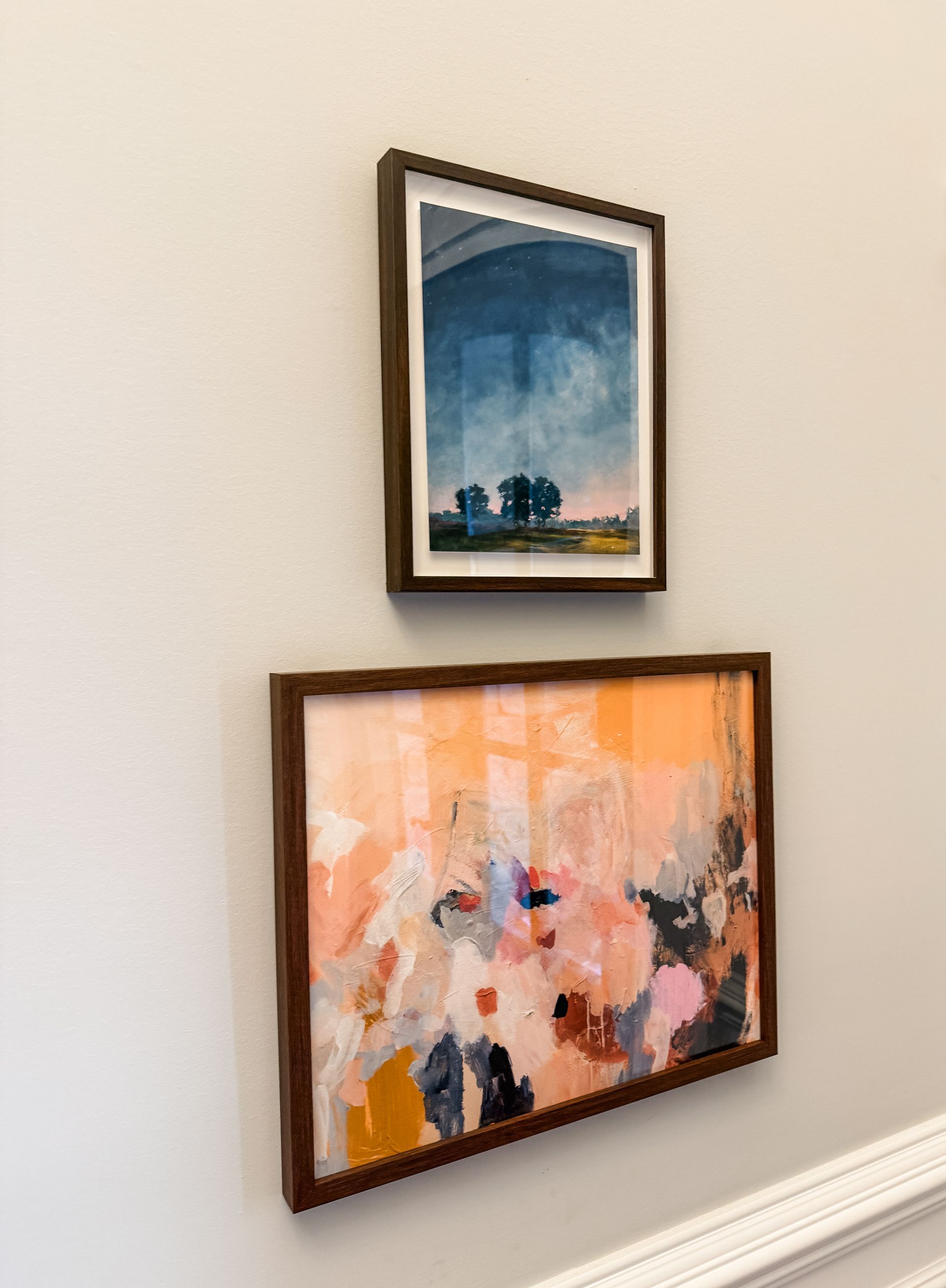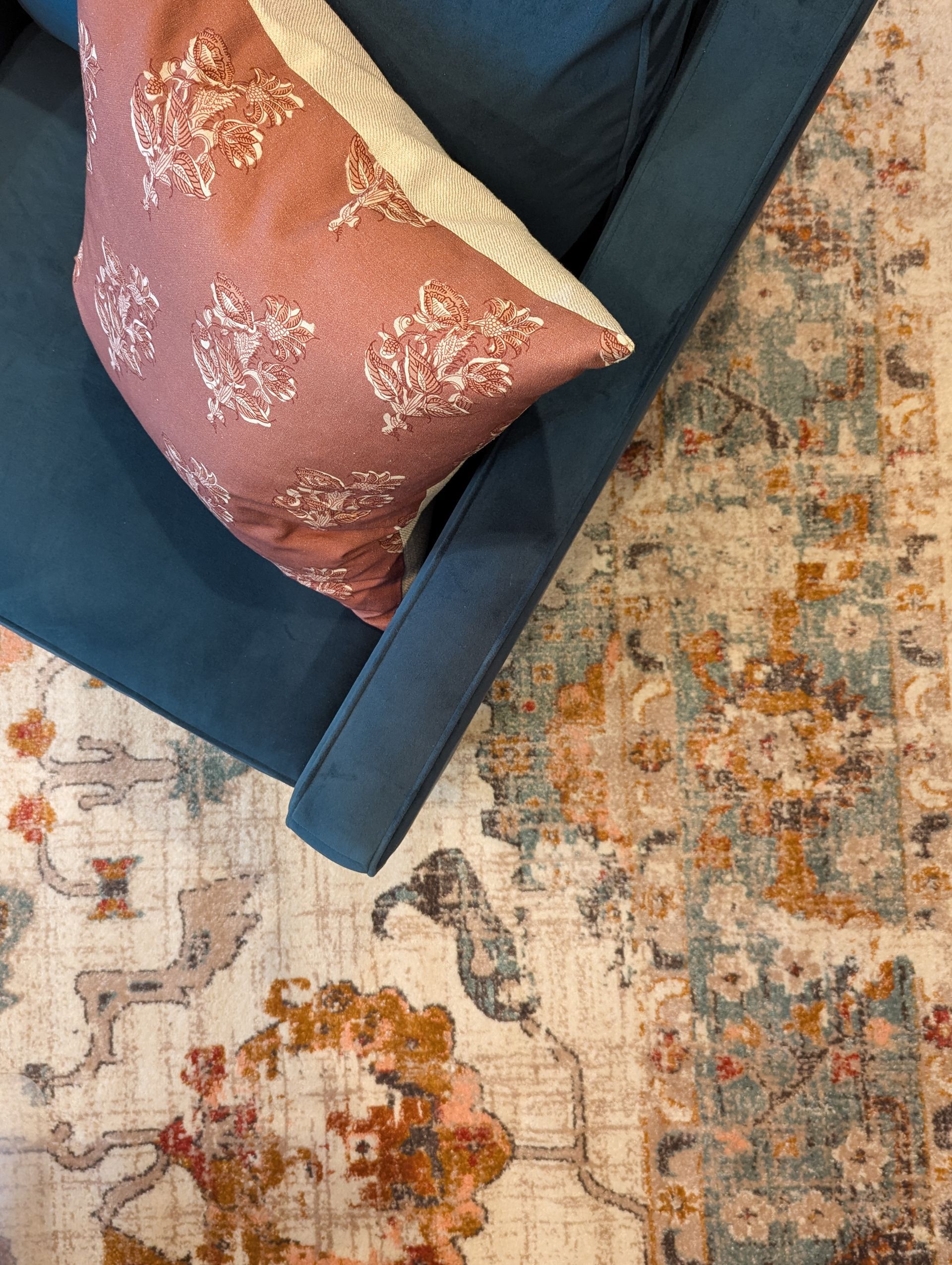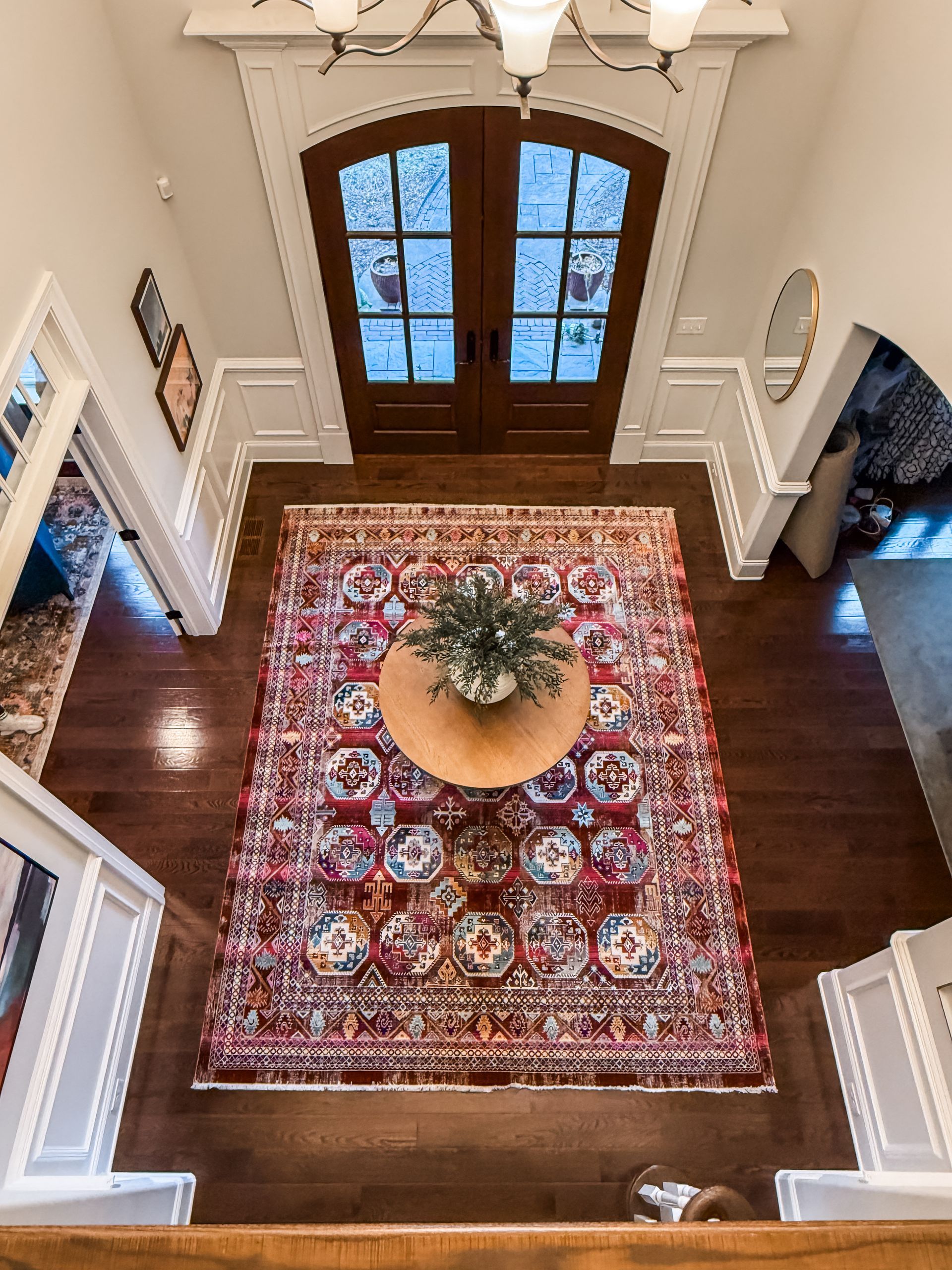 The foyer, which is the size of a small bedroom, was fairly empty and any art or furniture that was present was so small in scale in comparison to the size of the space. First and foremost, we knew a large, impactful area rug would immediately help fill the space. We also amped up the art, especially in color, to visually fill the space. Lastly, a round textured entry table with a large vase of stems capped off the design.