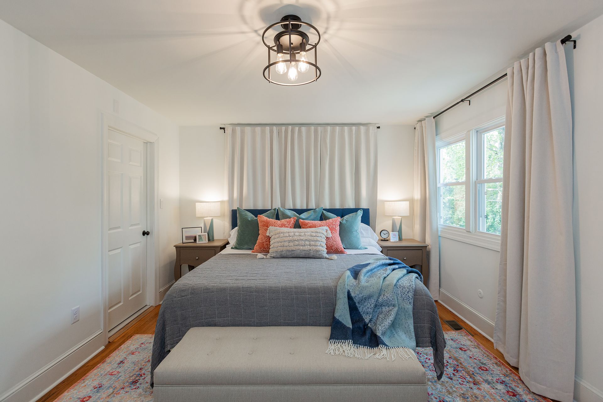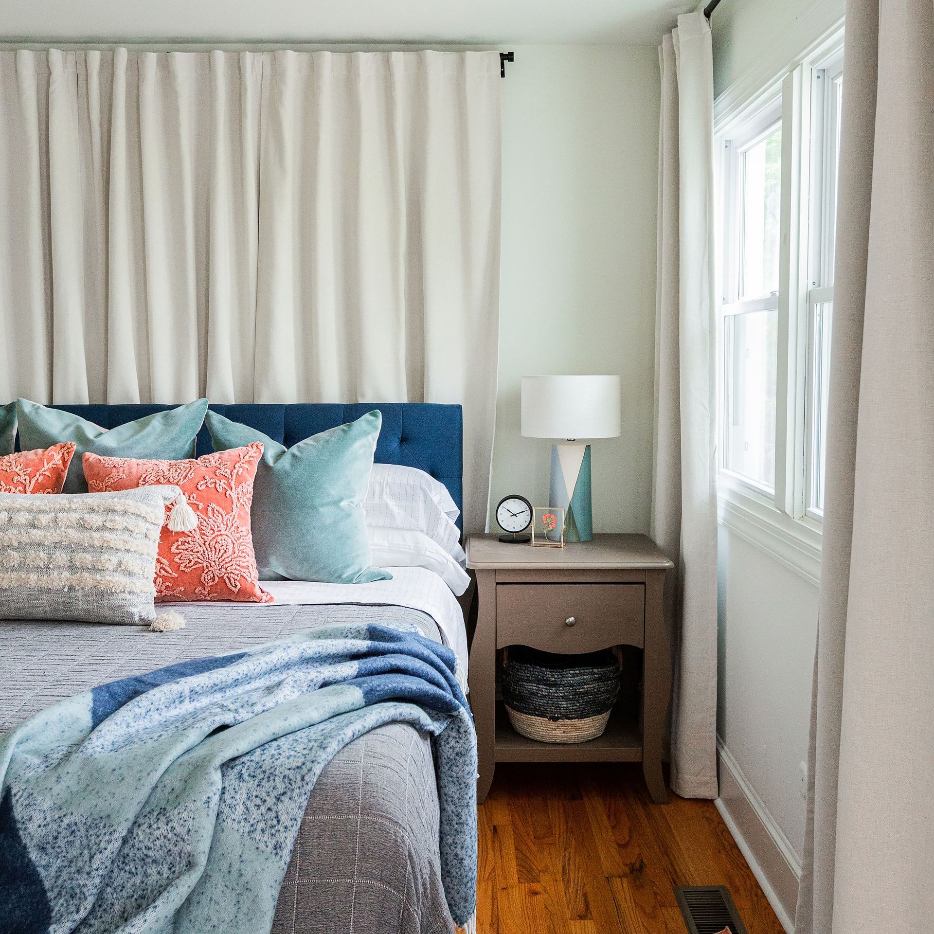 In this room refresh, we utilized all of our clients’ existing furniture, but layered in airier window treatments, a rug and additional bedding in playful colors, along with bright artwork to give it a complete makeover. The biggest challenge of this room was resolving the awkward window above the bed. Since this was the best layout for our homeowners, adding drapery across the back wall, as well as a pair of matching lamps, created symmetry and brought balance to the room. Our clients loved that we were able to breathe new life into their bedroom, without having to replace any of their existing core furniture. We think that smart design!