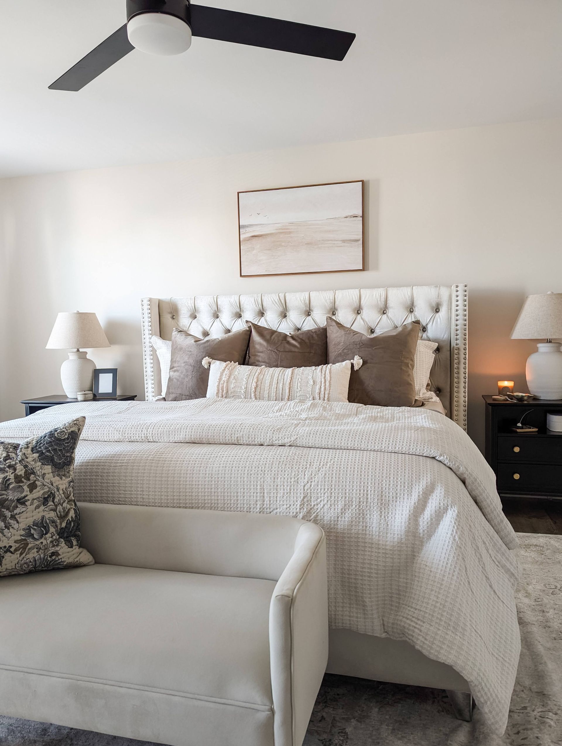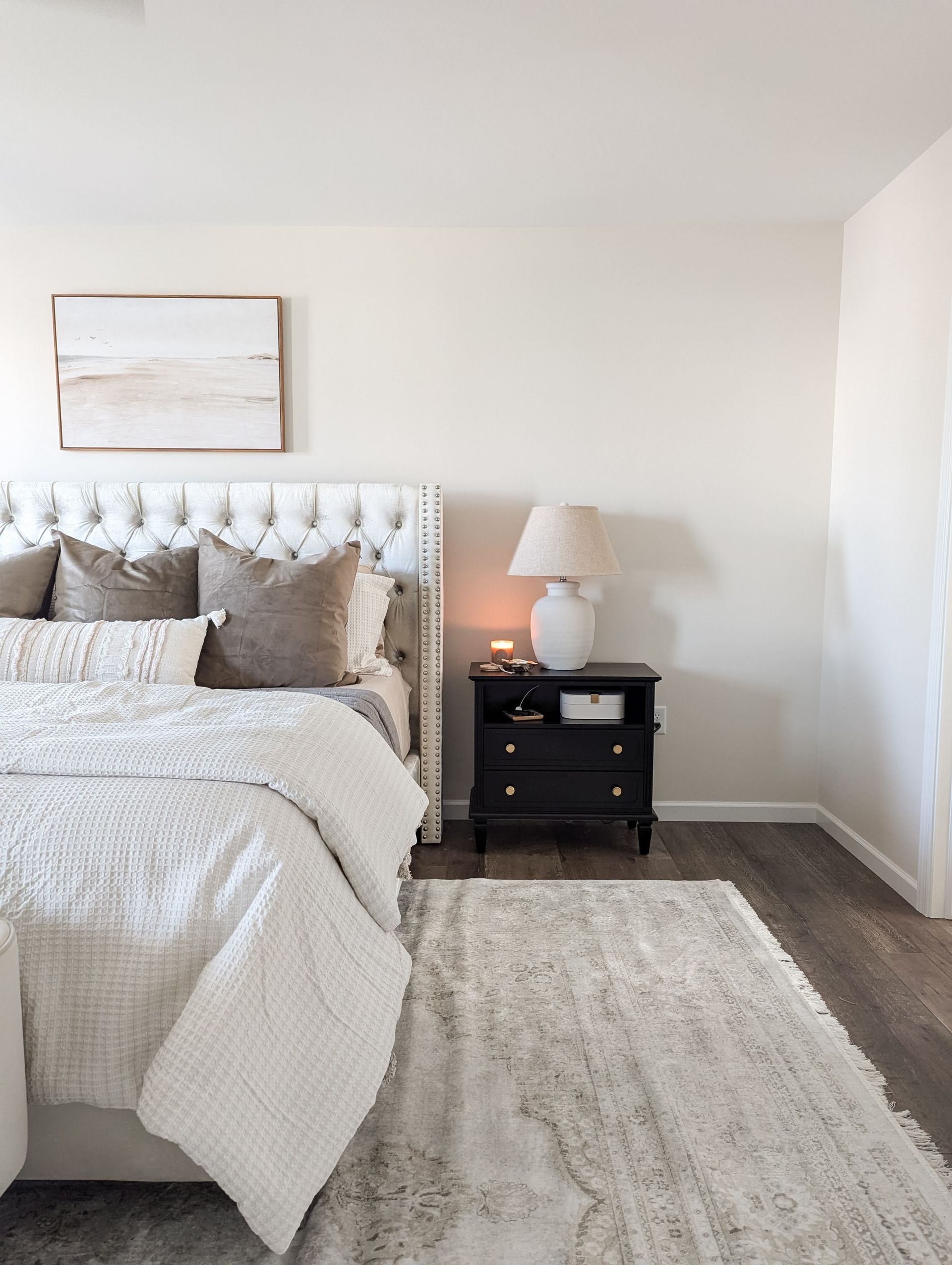 Before, the simple bedding, white walls and hard surfaces were falling a bit flat. A warmer shade of paint on the walls, a soft area rug, and layered bedding really upped the cozy-factor. Larger art and nightstands, as well as bringing in additional furniture, really helped to fill the space and make each item feel intentional. When reveal day finally came, our happy homeowners noted that their bedroom met all of their goals and was even better than they had anticipated! Success!