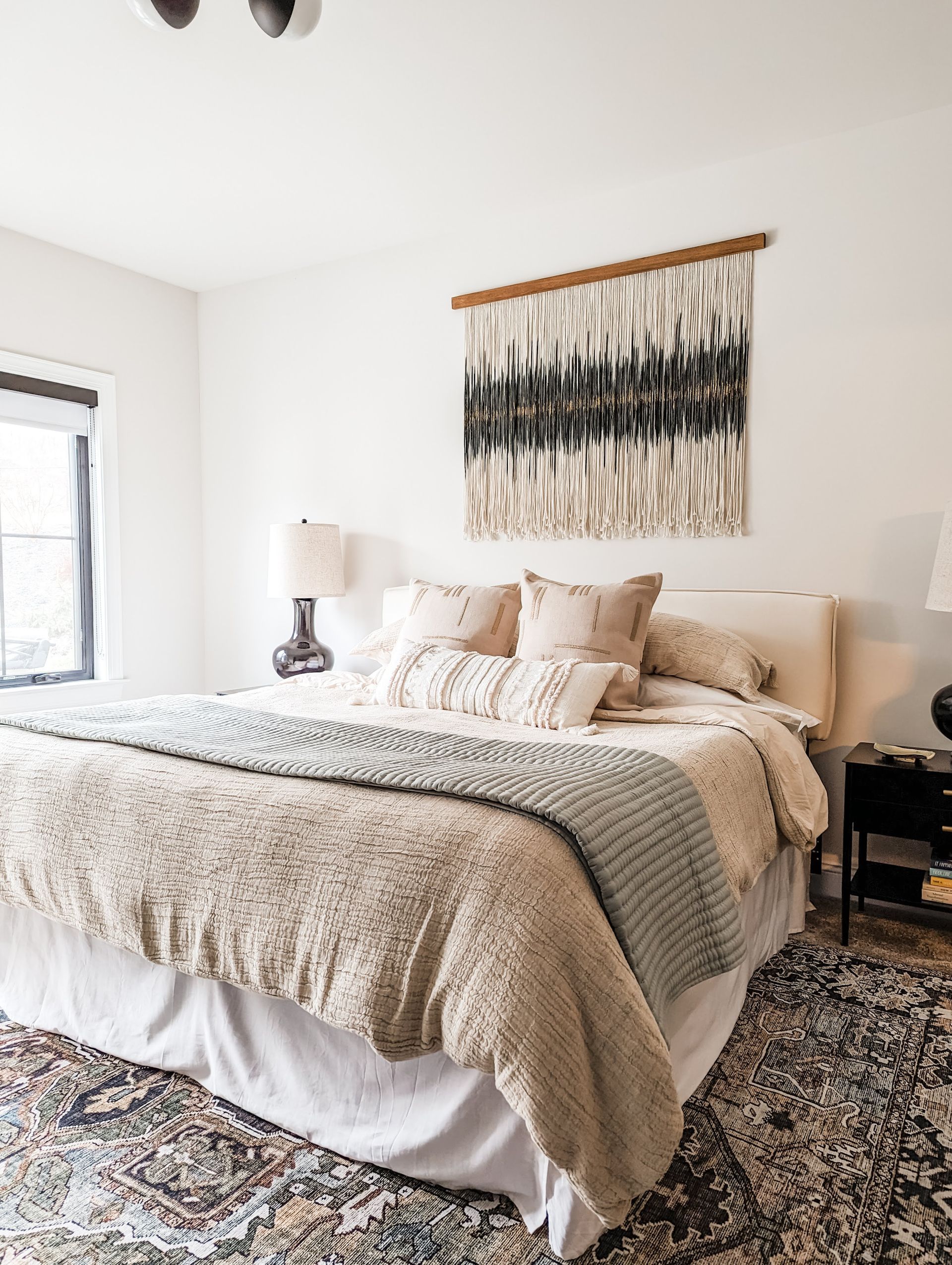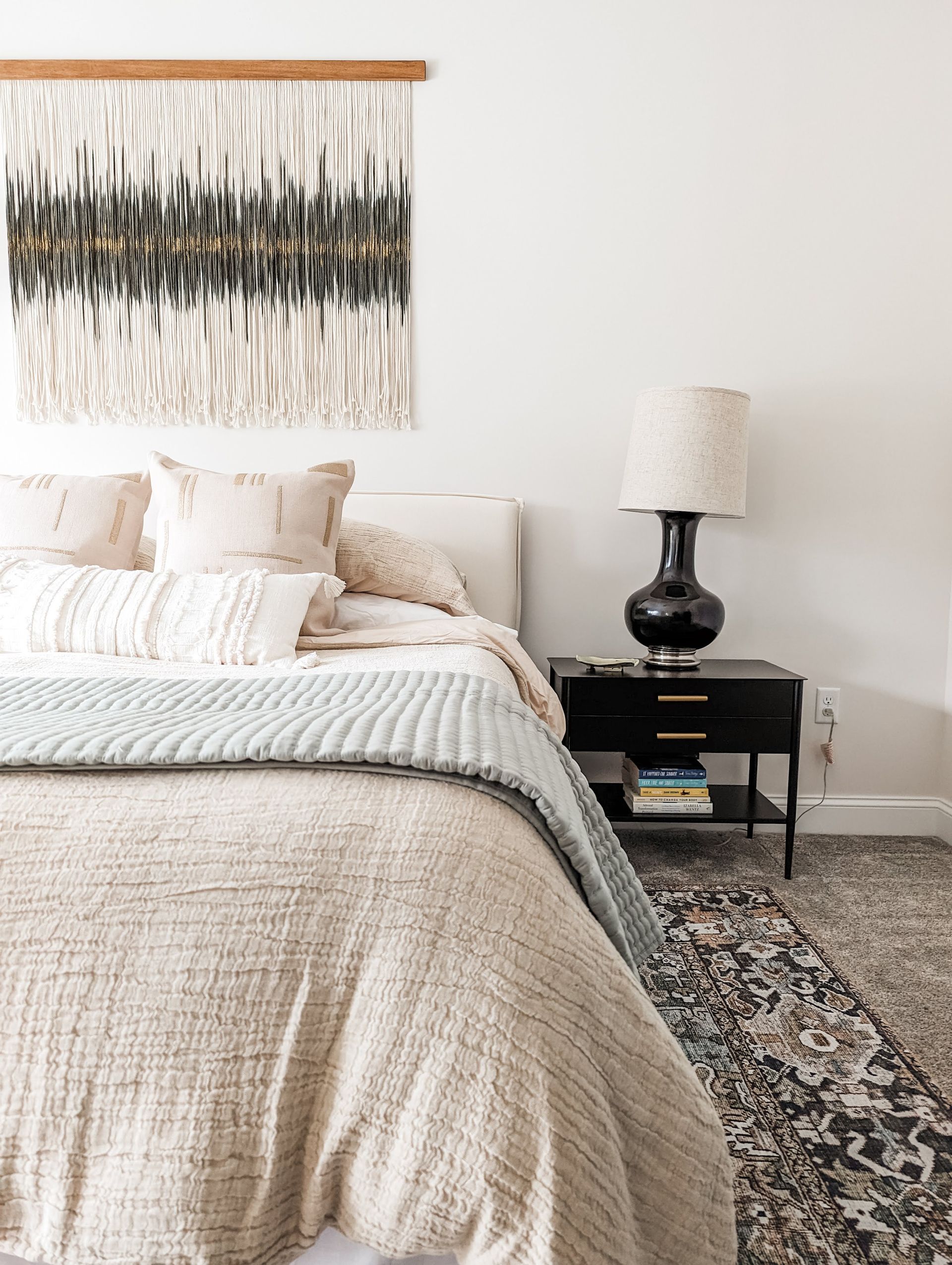 - swapped out the headboard for something simpler, so as not to compete with the wall hanging above