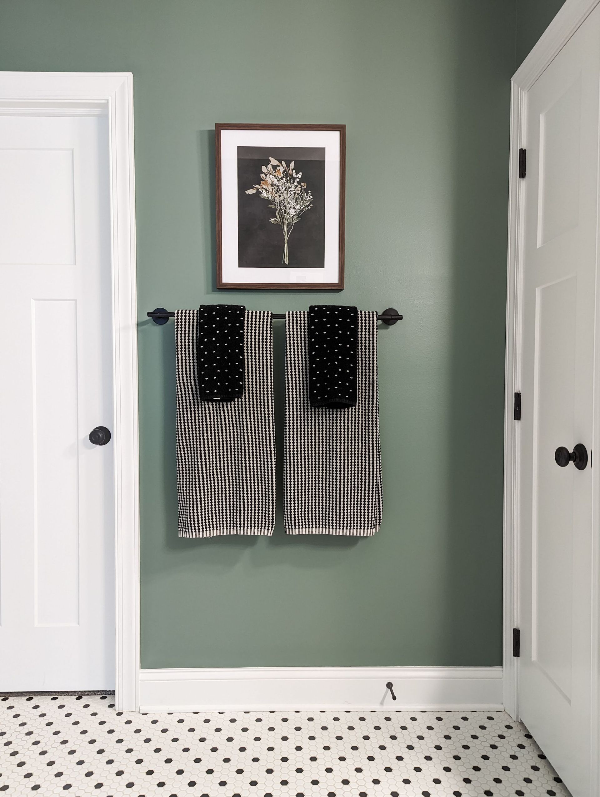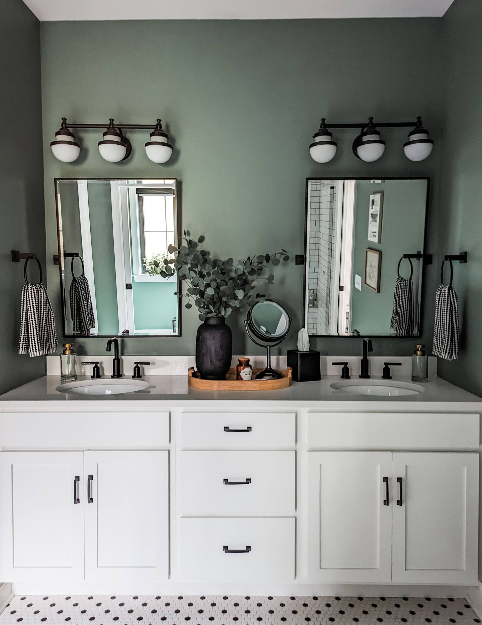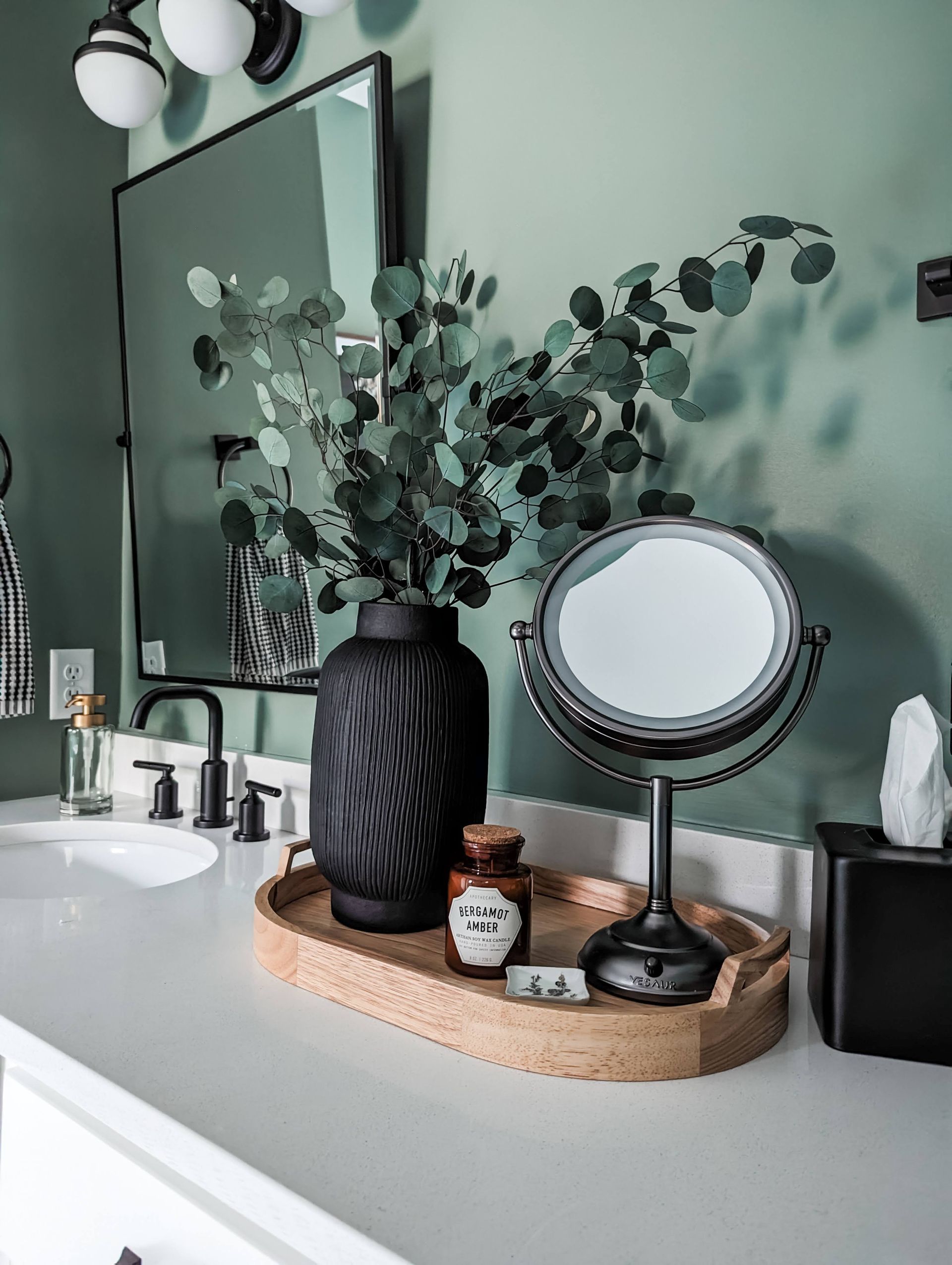 In the en suite, take a look at what paint and some styling can do to a room! This primary en suite was beautiful from the start. But, now it feels luxe and just a touch moody.