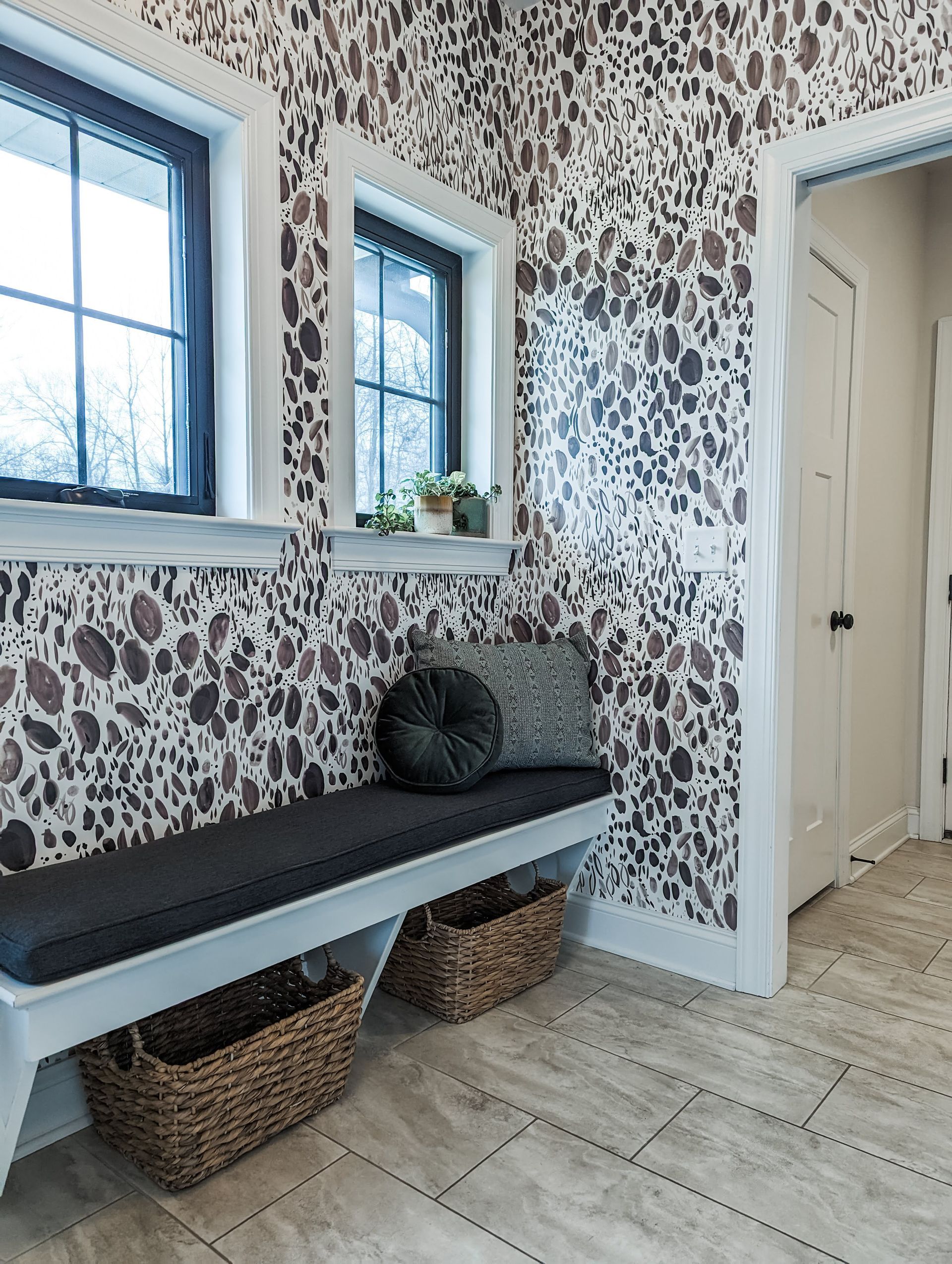 The entry welcomes guests with a hefty dose of “Hi! Welcome to our awesome house. A cool family lives here!” Just look at that wallpaper. It made such a difference. We love that our homeowner fell in love with this wallpaper just as much as we did. Knowing her love of bold prints and a desire for a black and white color palette that flowed throughout the main living areas, we felt this was the perfect choice. We loved that this print was graphic, while still maintaining an organic feel with its shapes and gradations of black and charcoal. The black door adds depth, the line are layers in another punch of color and bench got a makeover to add warmth and personality with a custom cushion, pillows, and baskets for shoe storage. Welcome home.