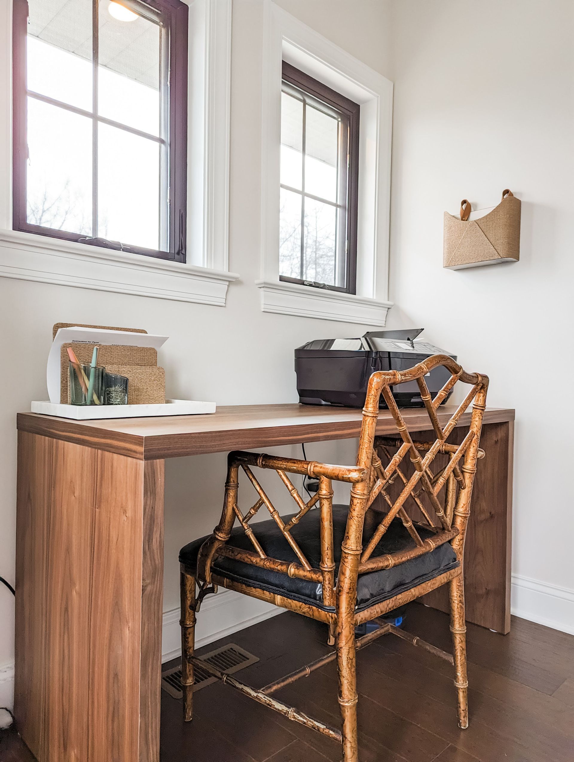 Right inside the entry is what we refer to as the “mini-office.” It’s the spot where our homeowners house their printer, pay the bills, and keep work documents. So, function was key. However, being right inside the door where friends and family enter, it had to look cute too! We swapped their white utilitarian desk for one with simple clean lines and a beautiful wood tone. That, along with a few simple rattan organizers, add warmth to this area. The art injects a splash of color to the crisp white walls. It’s always fun to see how just a few small tweaks can really transform a space.