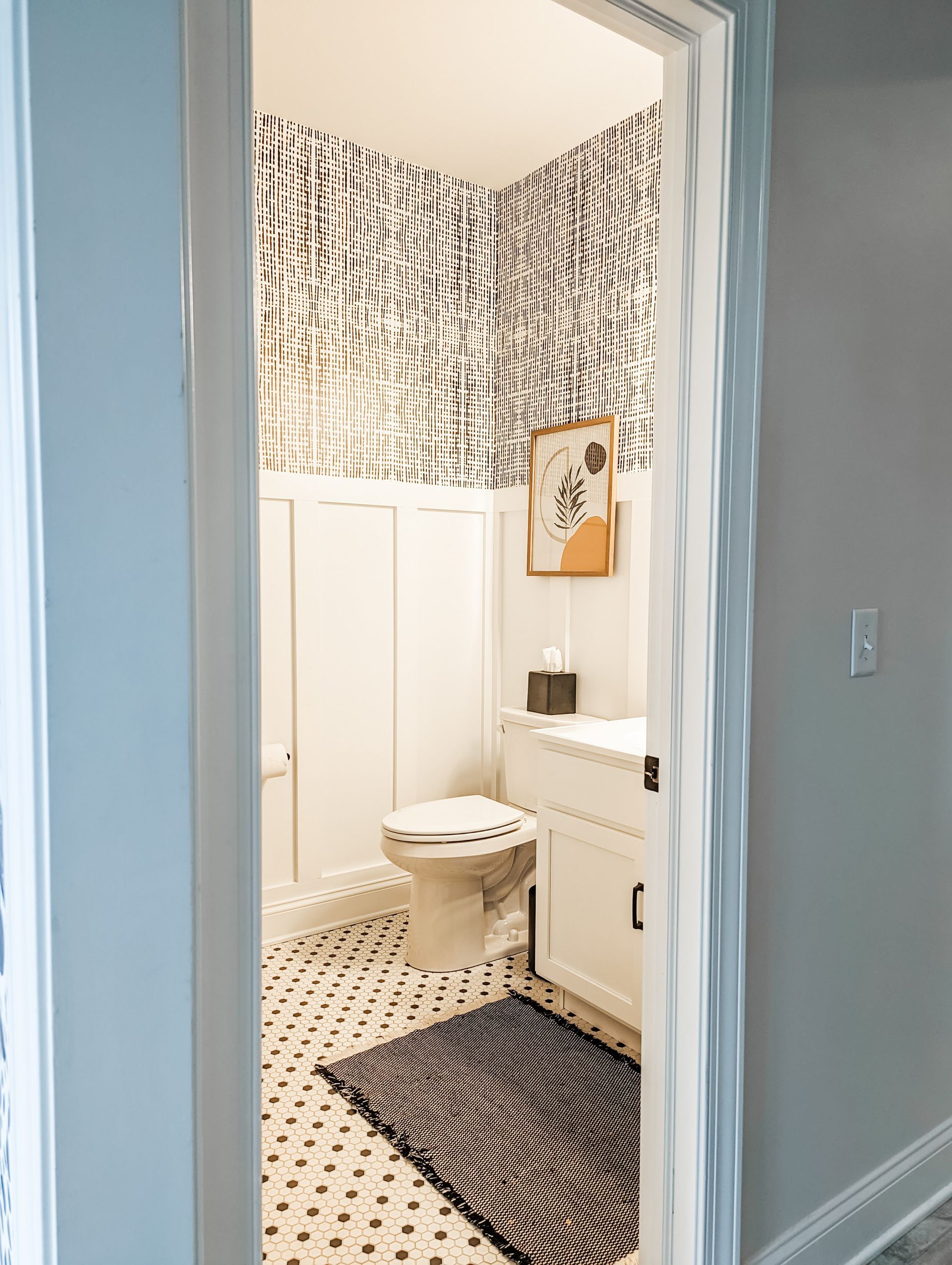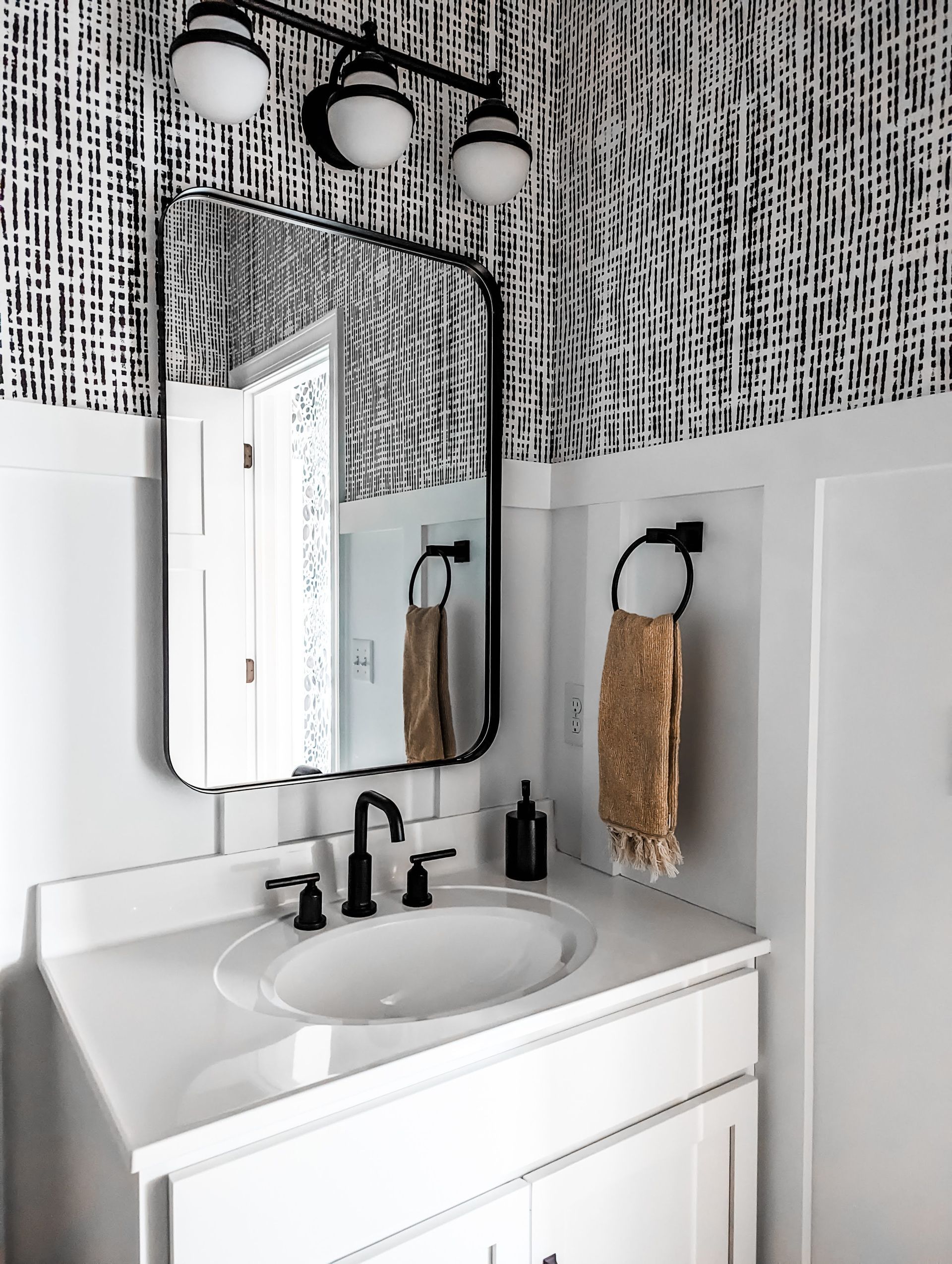 This first floor powder room was cute from the start. We loved the black and white tiles, mirror and fixtures our homeowner had chosen for her new build. But we all agreed— we could kick it up a notch! Cue the board and batten and wallpaper! Now, it's got added dimension and interest. To keep things from feeling stark, with all of the black and white, we added a small dose of mustard and and the warmth of wood in the art and table. And, as an added bonus, she’s now got a bit of additional storage and spot for some pretty candles.