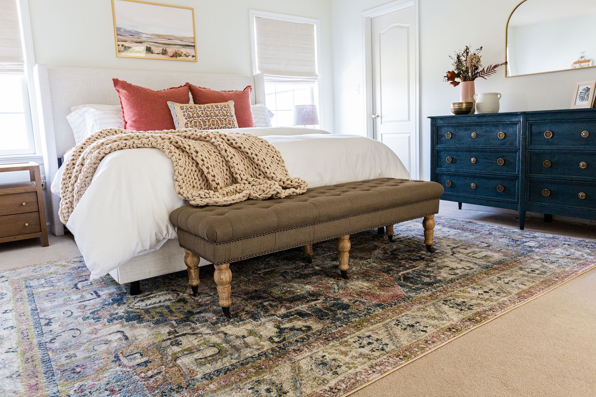 Check out this stunning Owners’ Suite that we had the privilege of giving a complete Room Refresh. From the luxury bedding and vintage wall art, the oversized nightstands and gorgeous deep blue dresser, the beaded chandelier, wood carved mirror and of course the rich rug that pulls it all together— everything in this room whispers, “come relax here...” And, we’re happy to report that our homeowners think it’s pretty dreamy too. The proof came via text the day after their first night in their new space - they said it was like sleeping on a cloud!