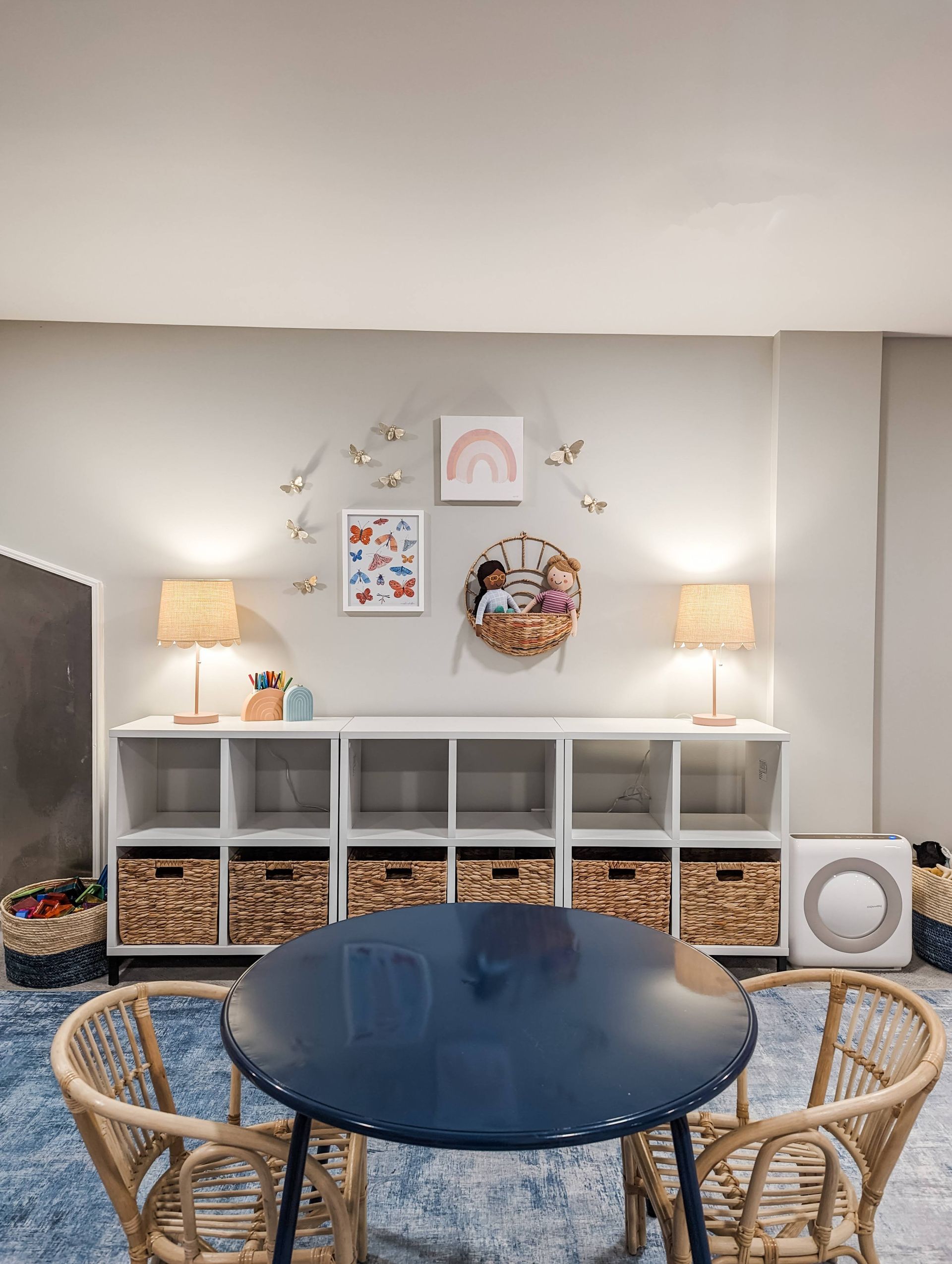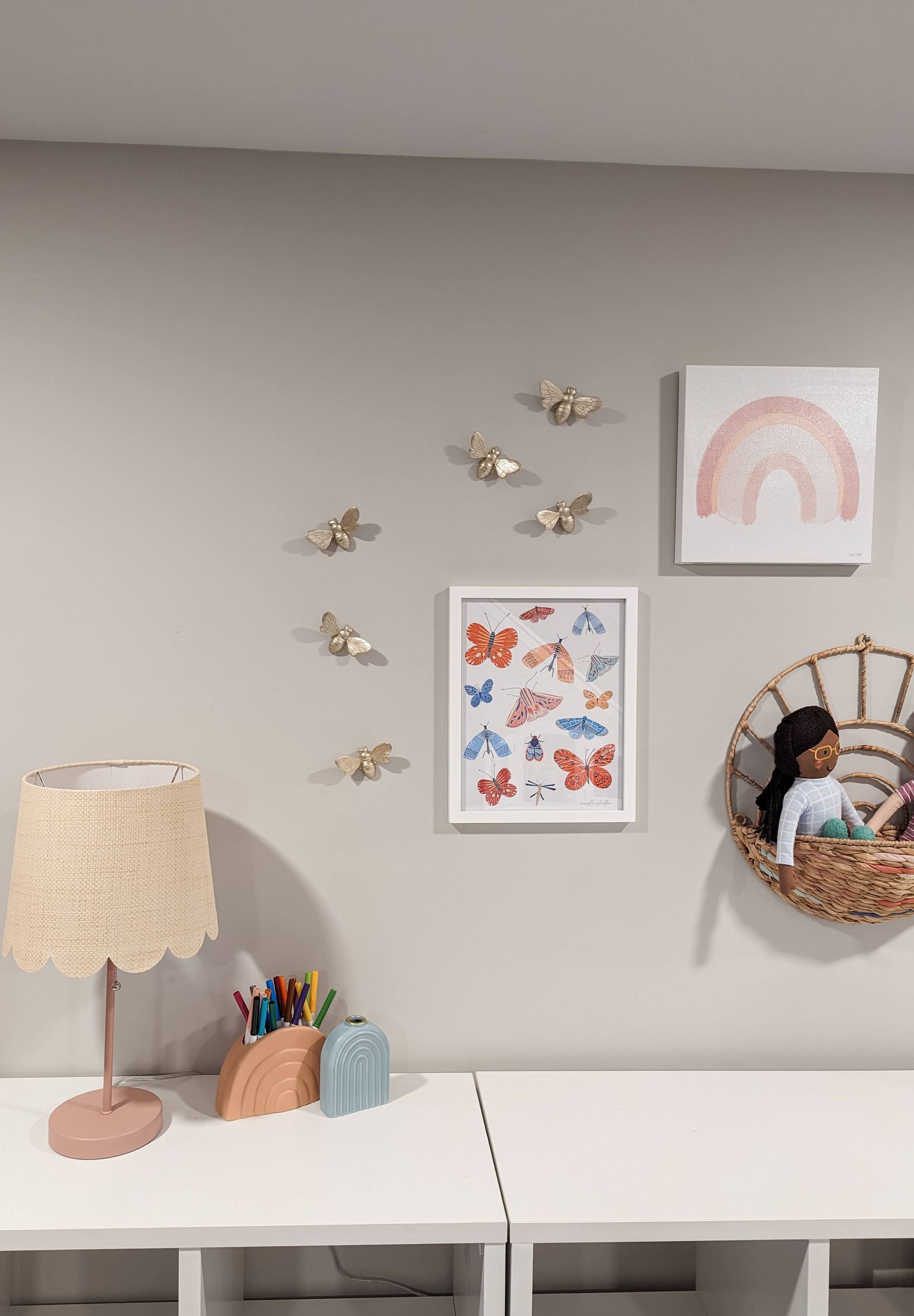 We fell in love with so many of the details in this space like the scalloped lampshades, butterfly artwork, rattan chairs, and bumblebee wall figurines.