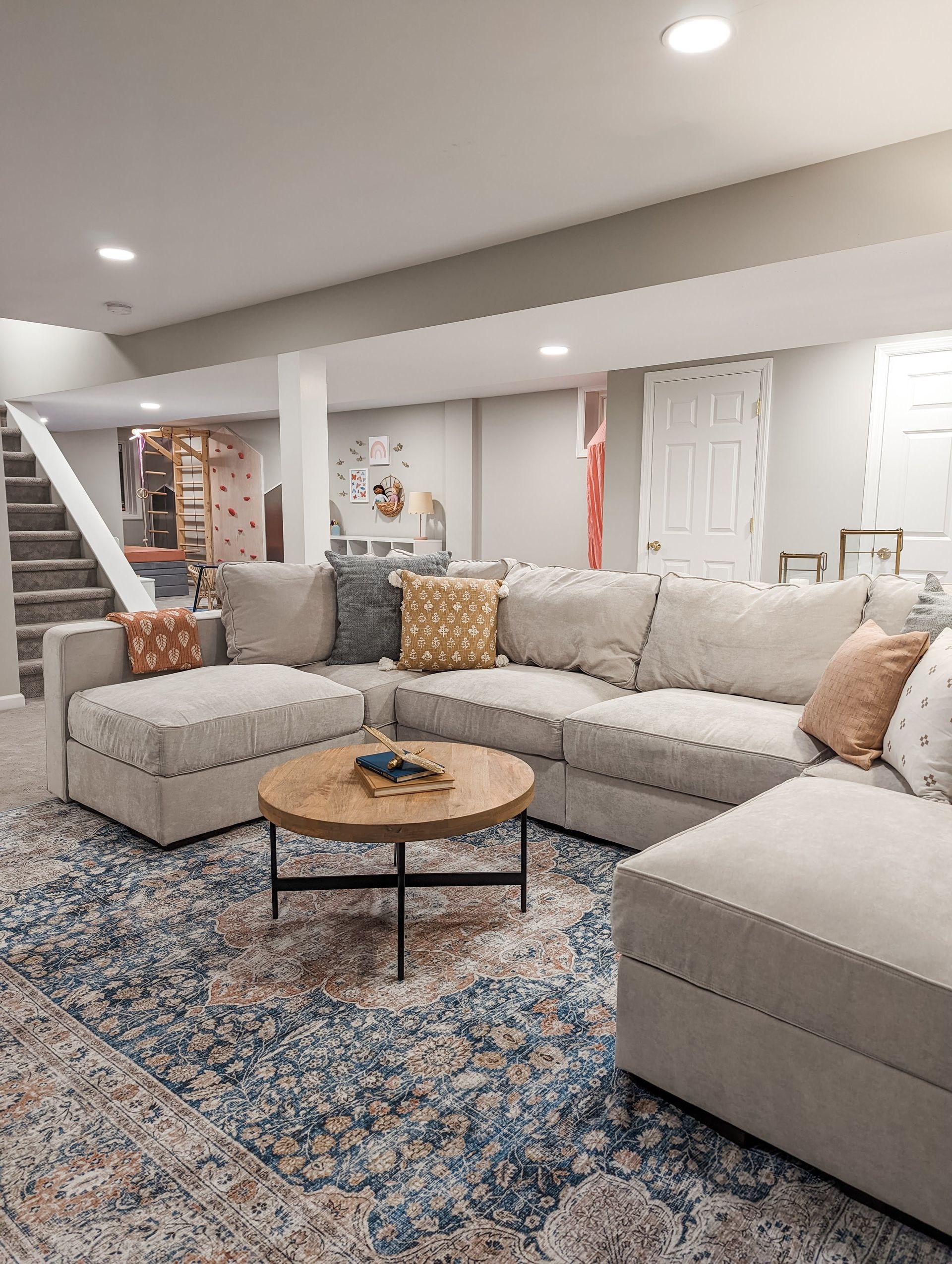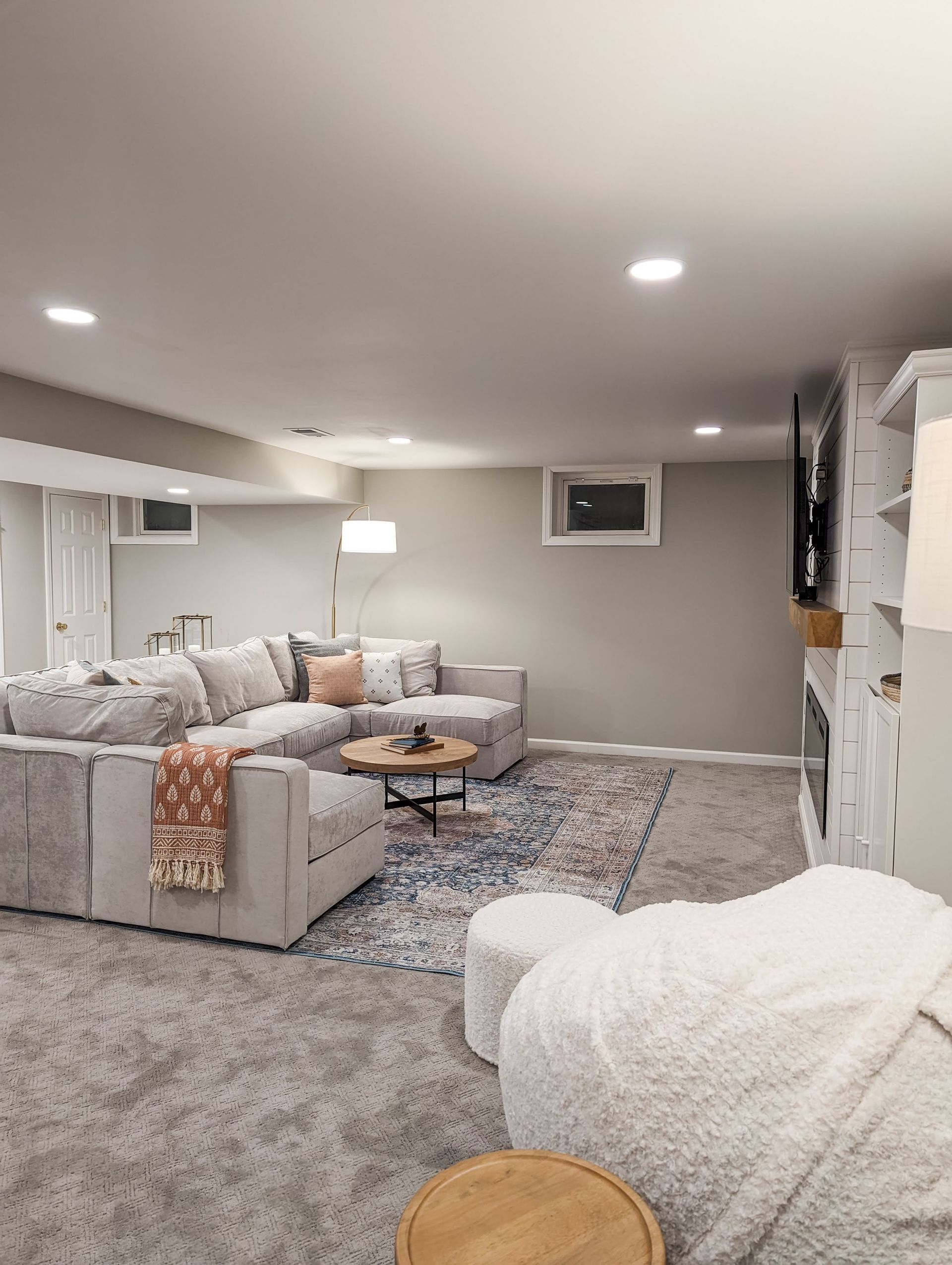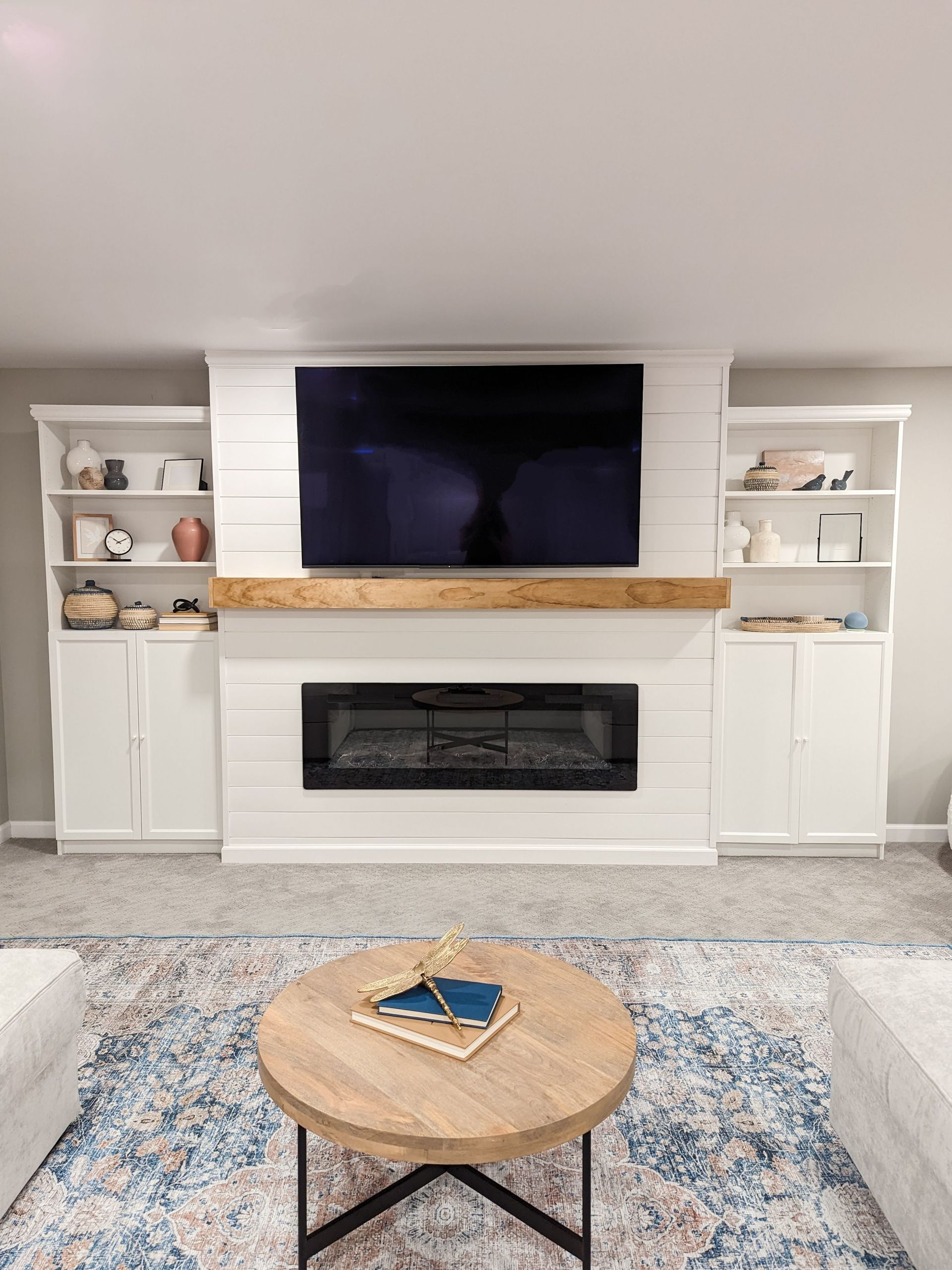 Our clients had recently finished their basement and were looking for help to make it feel finished. The goal for this space was to meet three core needs for their family: a relaxing living space, a space to work out when they couldn't make it to the gym, and a play space for their little one! The showstopper of this kick-back zone is definitely the new fireplace and built-ins. We helped determine the final design for the fireplace/built-ins and our clients' talented family member built them!