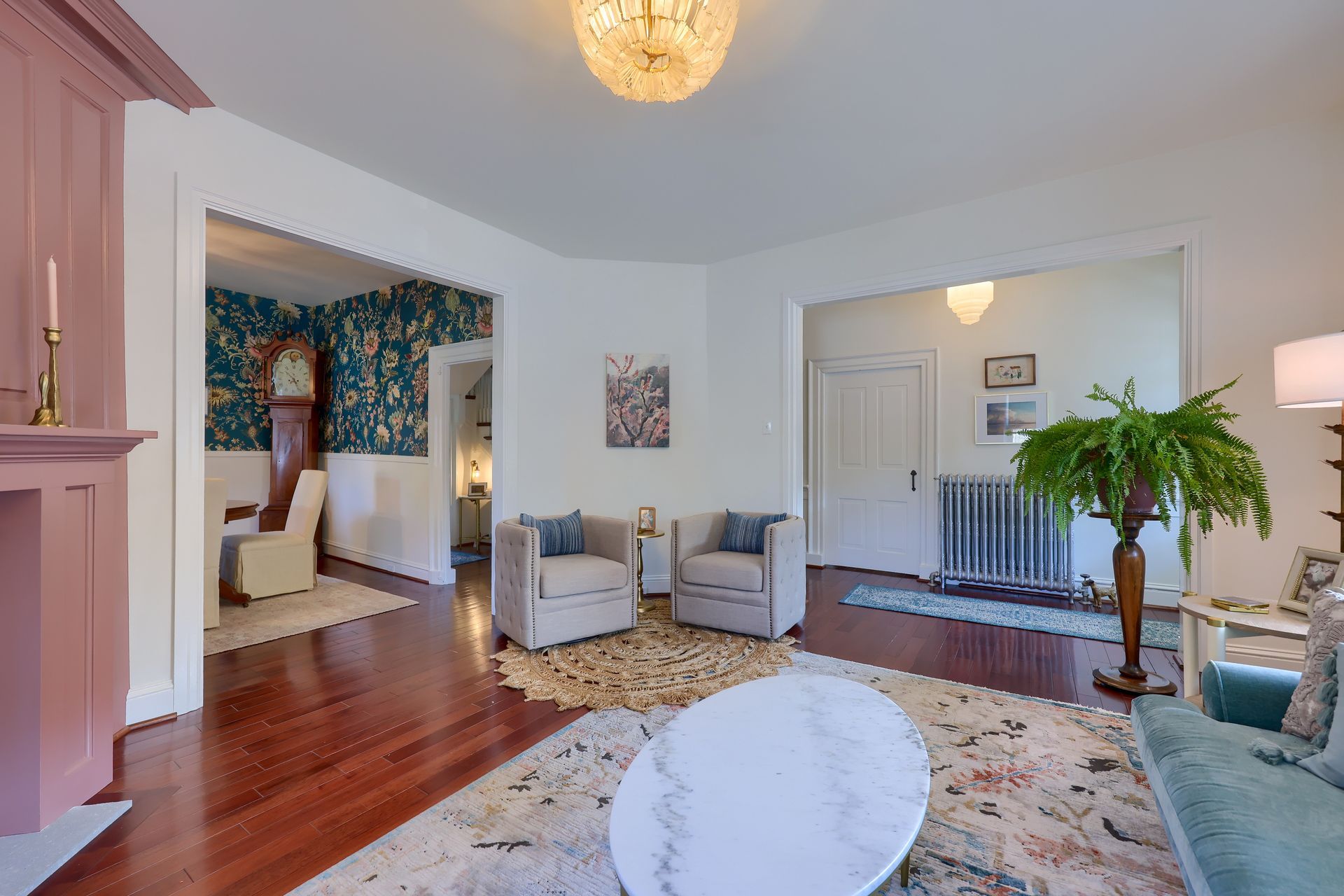 The dining room is brimming with personality, striking a perfect balance between formality and fun. Our client knew from the start that she wanted wallpaper in the space….um, agreed! Her dining table and cabinet remained, while new upholstered chairs and dramatic chandelier added some softness and shine.