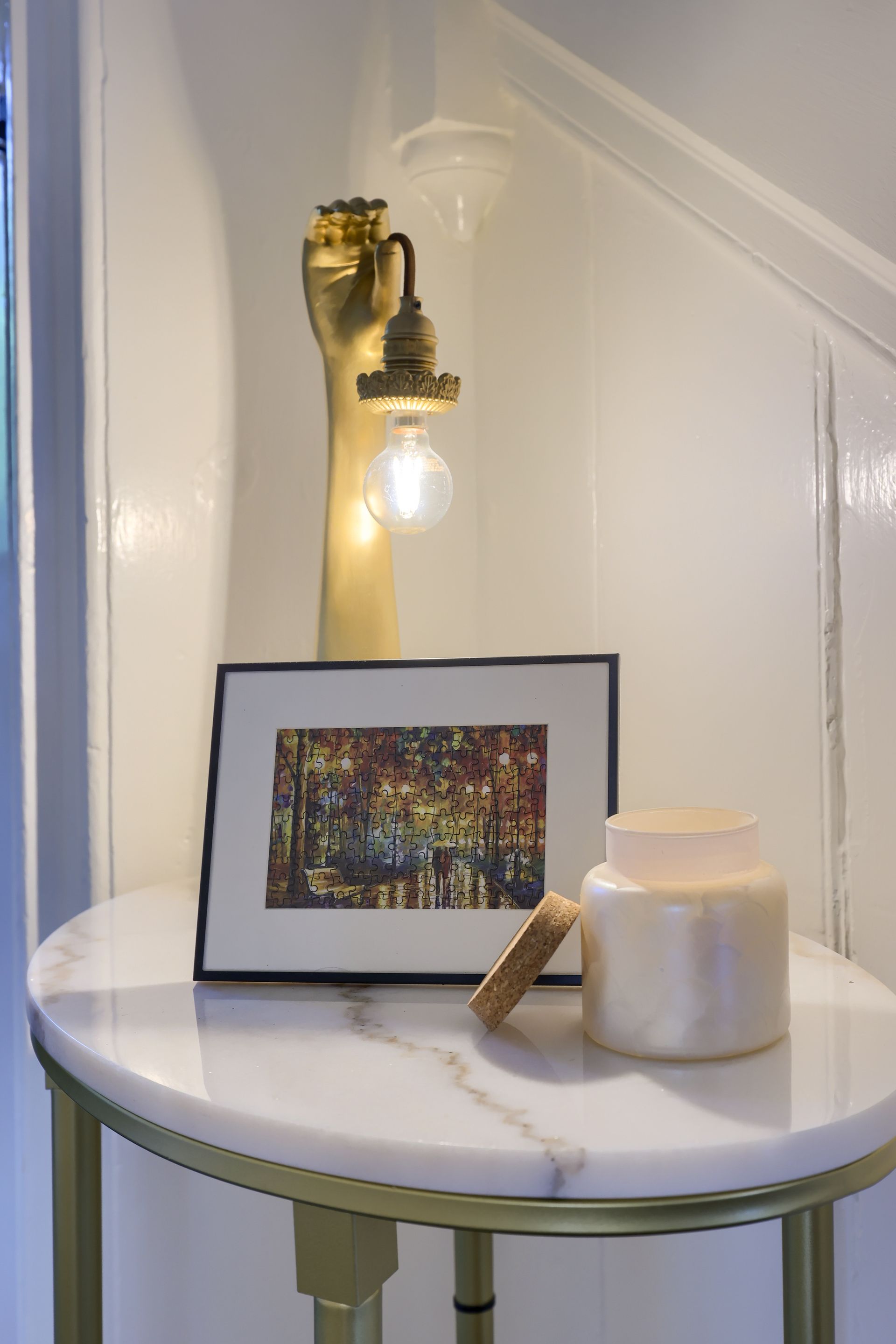 The entry hall got its own refresh with new lighting, runners, wall art and accent table. How fun is the little lamp?! We fell as much in love with this space as the homeowners!
